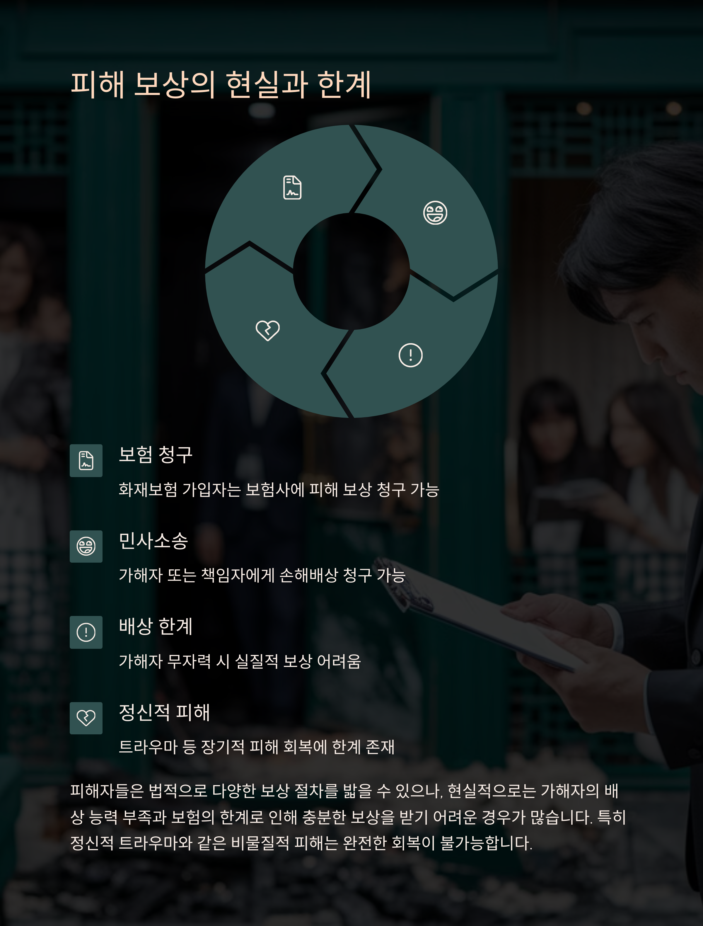 가해자가 사망하거나 무자력일 경우, 실질적인 배상은 보험 한도 내에서만 이뤄질 수 있다. 피해가 크고 가해자에게 자력이 없다면, 피해자들은 충분한 보상을 받지 못할 위험이 크다.