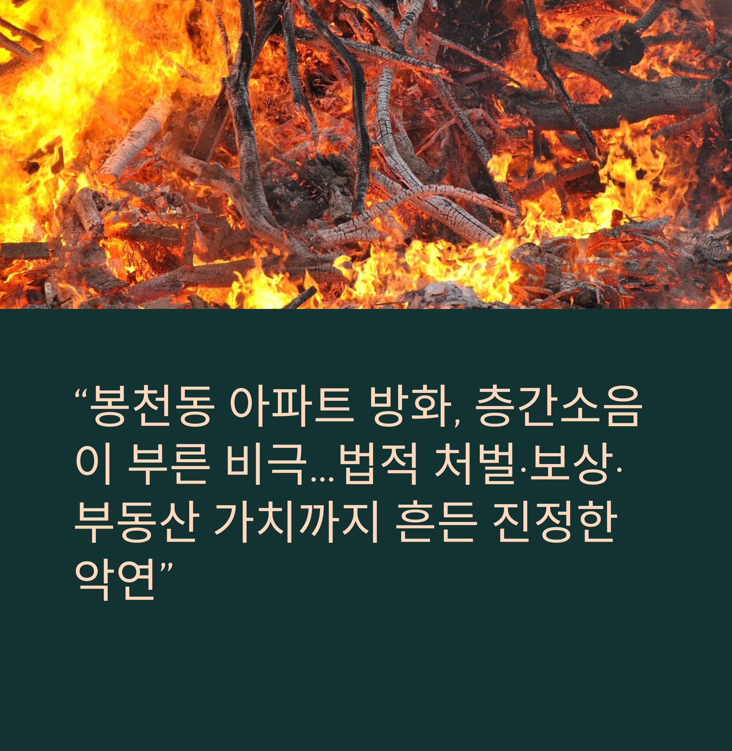 서울 관악구 봉천동의 한 아파트에서 발생한 방화 사건은 단순한 화재 사고가 아닌, 층간소음 갈등이 극단으로 치달아 발생한 사회적 비극이었다. 이 사건은 법적 처벌, 민사상 보상, 그리고 부동산 시장에 미치는 파장까지 우리 사회의 여러 단면을 드러내고 있다.
