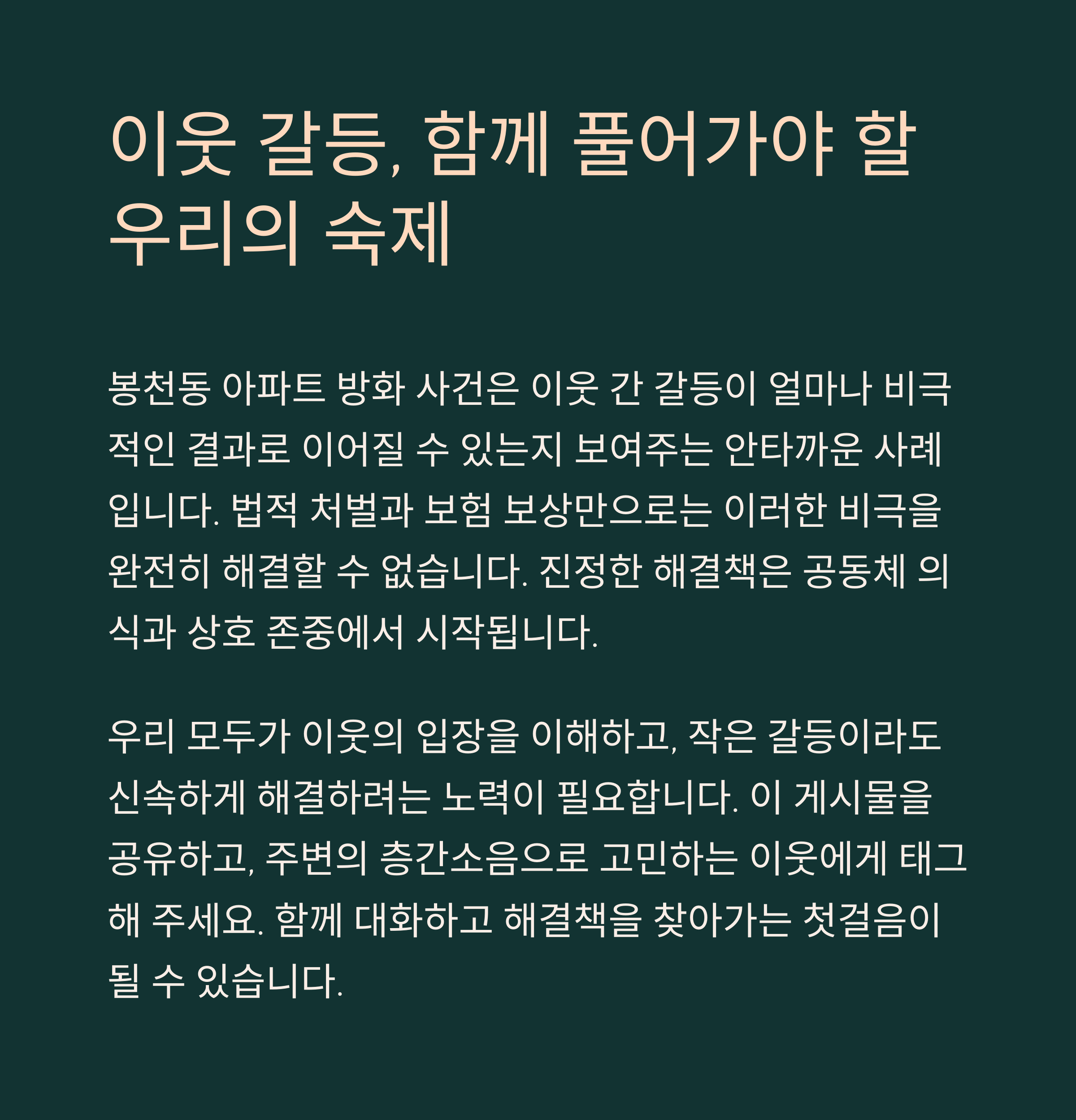 봉천동 아파트 방화 사건은 층간소음이라는 일상적 갈등이 법적·경제적·사회적으로 얼마나 큰 파장을 불러올 수 있는지 경고한다. 법적으로는 방화범에 대한 중형, 민사상 거액의 손해배상, 그리고 부동산 가치 하락까지, 한 번의 극단적 선택이 남긴 상처는 쉽게 아물지 않는다. 이웃 간 갈등이 비극으로 번지지 않도록, 사회 전체의 경각심과 제도적 보완이 절실하다.