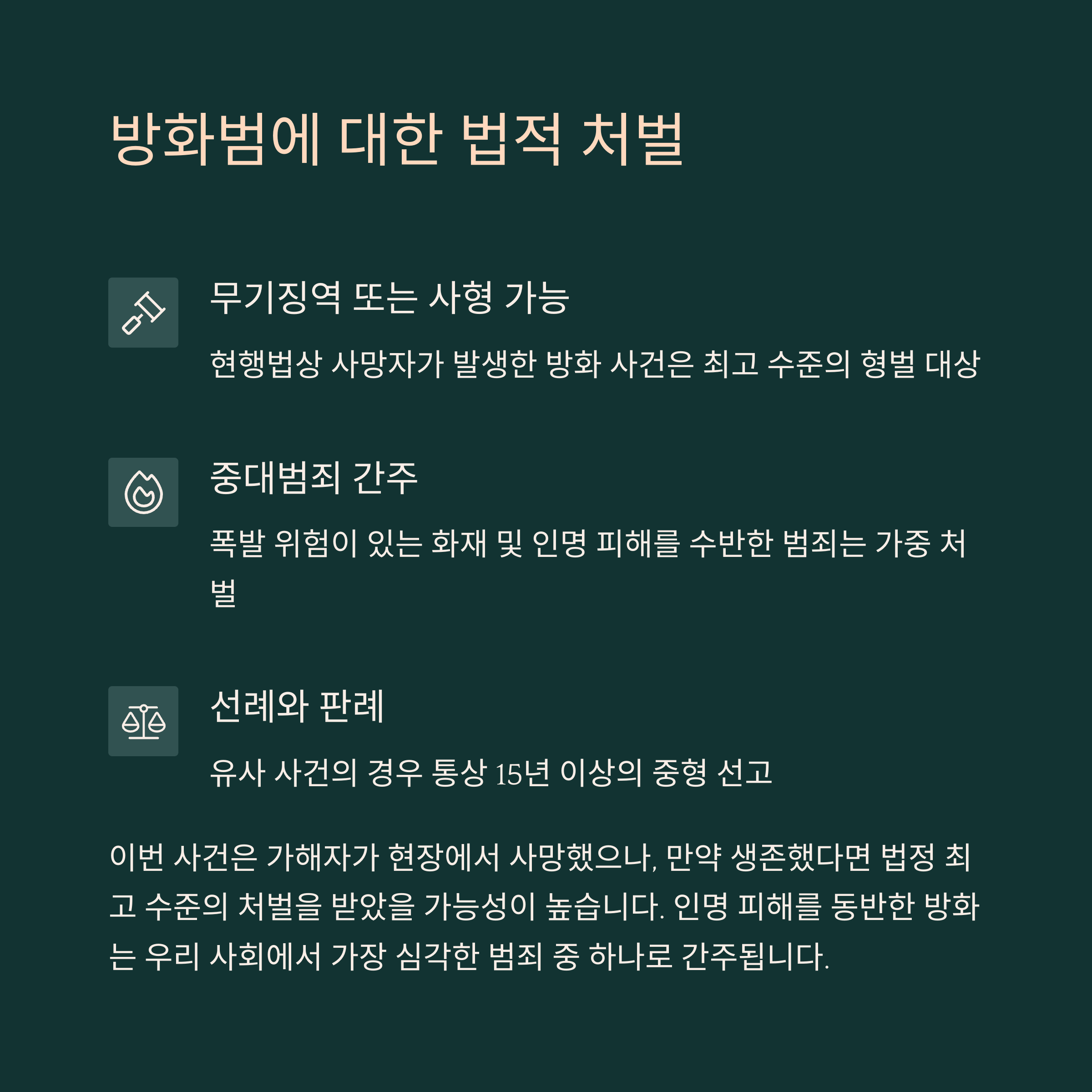 이번 사건처럼 사망자와 중상자가 발생했다면, 방화범이 생존했다면 최소 무기징역 또는 매우 중한 실형이 불가피하다.