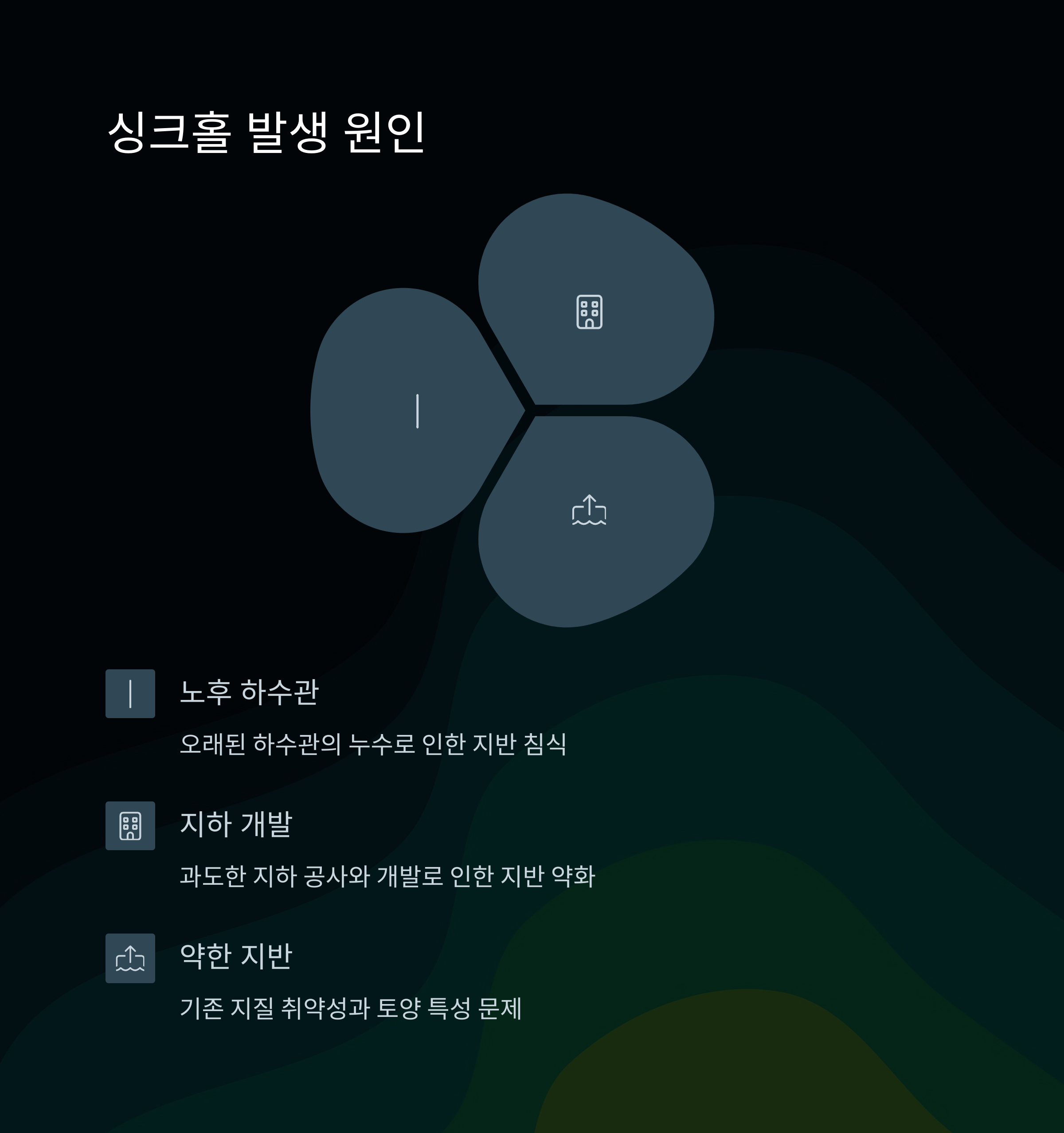 를 꼽고 있습니다. 특히 대형 싱크홀의 경우, 단순 하수도 노후보다는 대규모 지하공사와 지반 보강 부실 등 복합적인 인위적 요인이 크게 작용한다는 지적이 나옵니다.