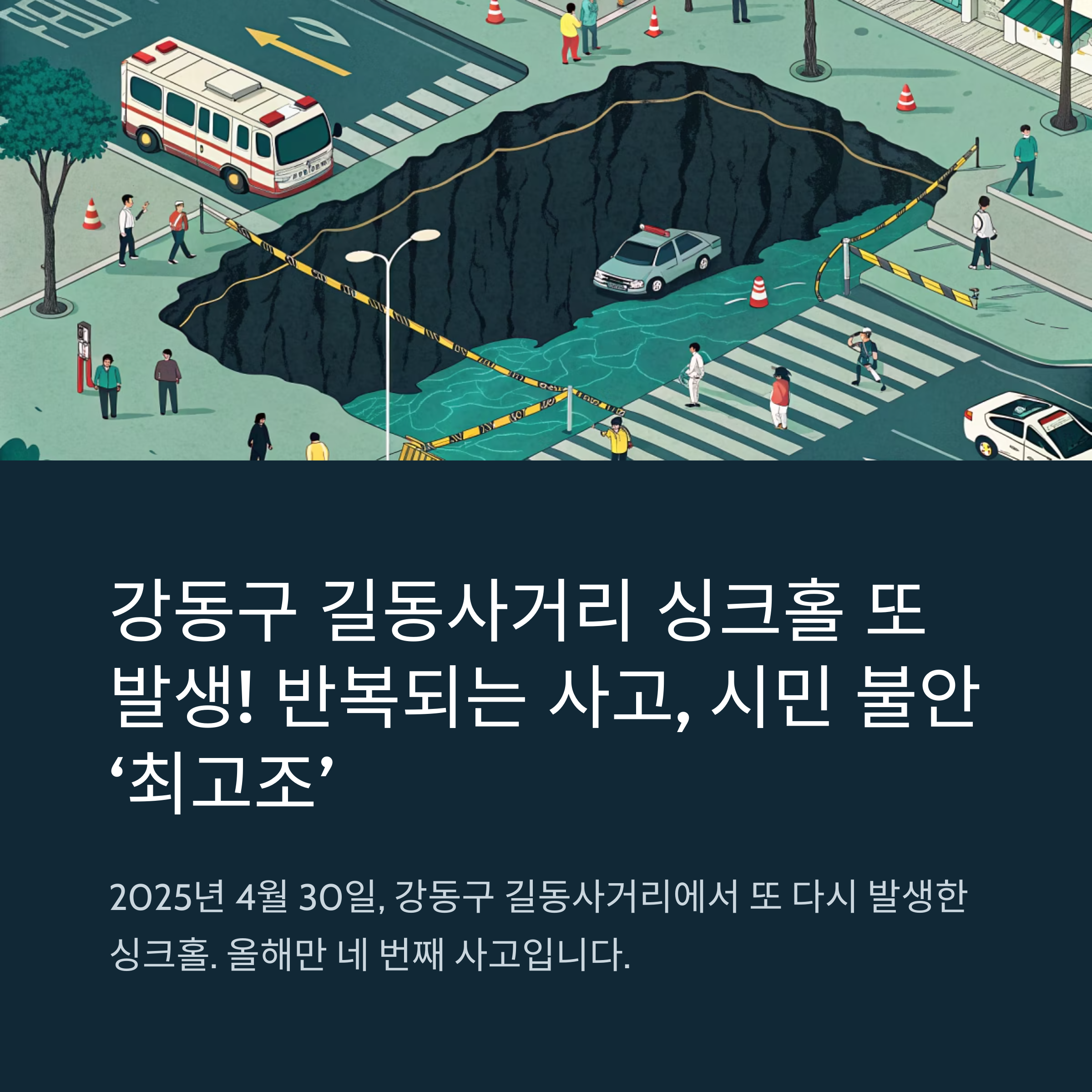 강동구 길동사거리 싱크홀 사고는 단순한 도로 함몰이 아닌, 반복되는 구조적 문제임을 보여줍니다. 시민 안전을 위한 근본적 대책과 투명한 정보 공개, 신속한 보상 체계 마련이 절실합니다.