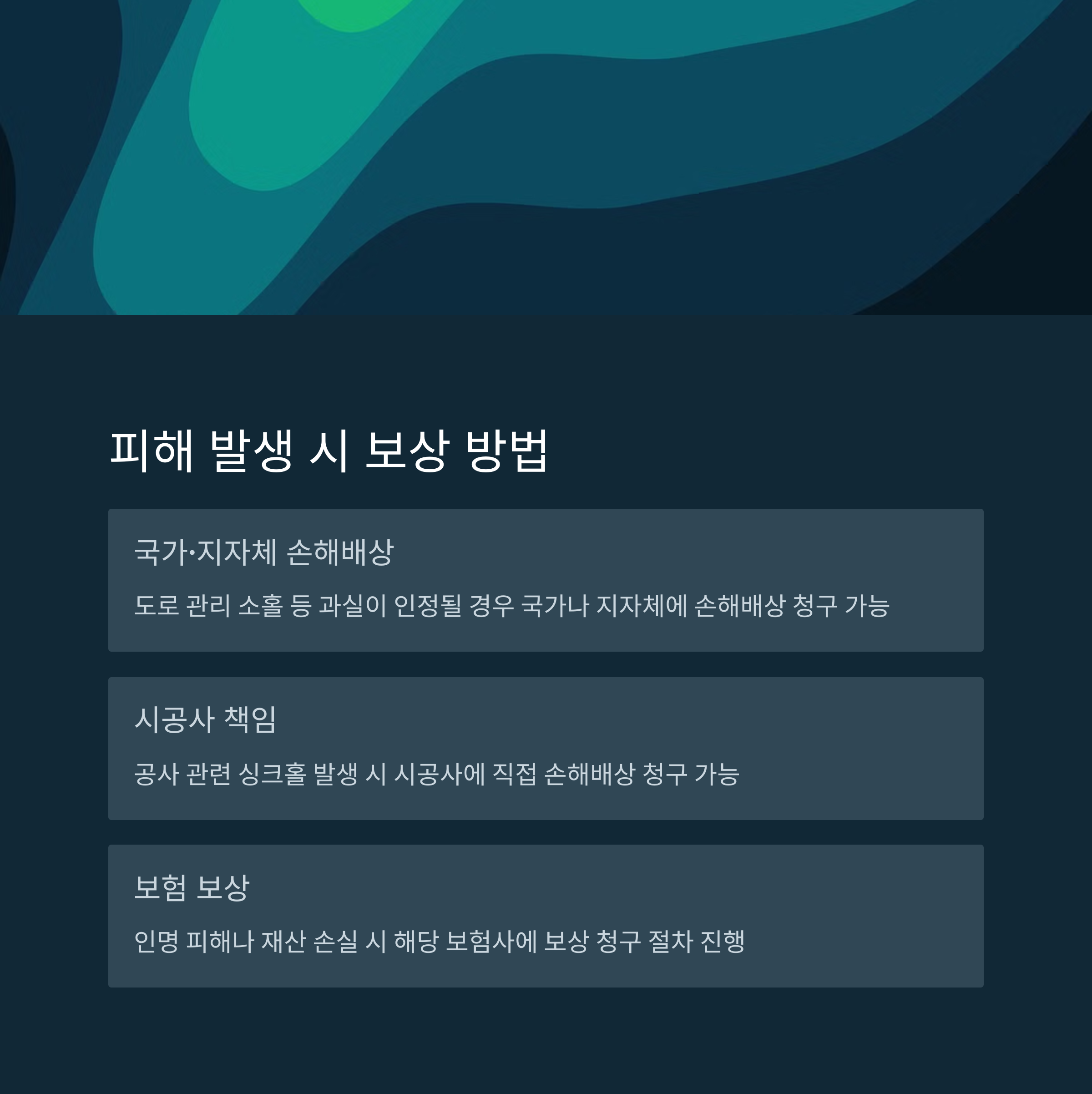 싱크홀로 인한 인명 피해(사망 등)가 발생하면, 도로 관리 책임이 있는 국가·지자체(서울시, 강동구청) 또는 공사 시공사에 손해배상을 청구할 수 있습니다. 실제로 3월 명일동 대형 싱크홀 사고처럼 인명 피해가 발생하면