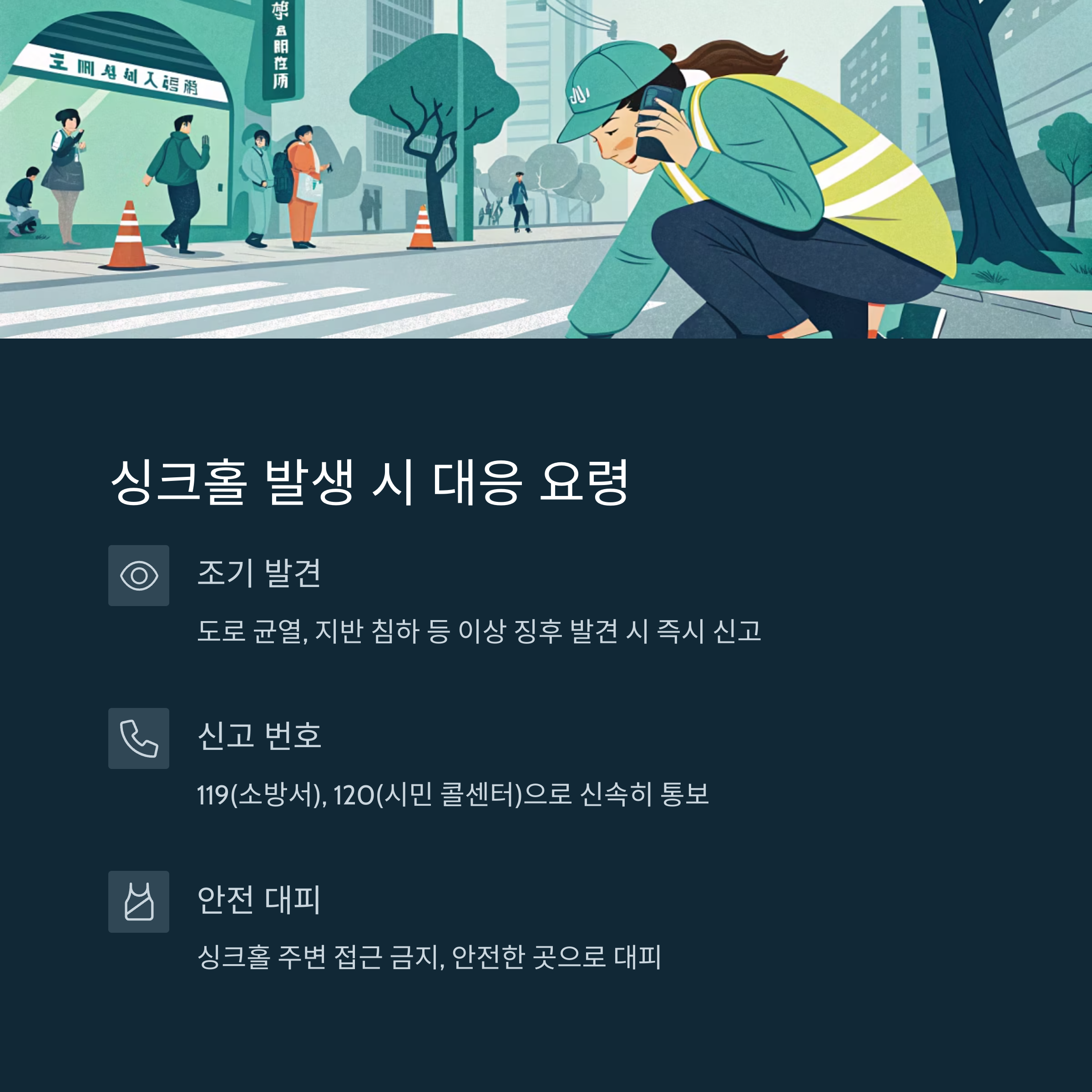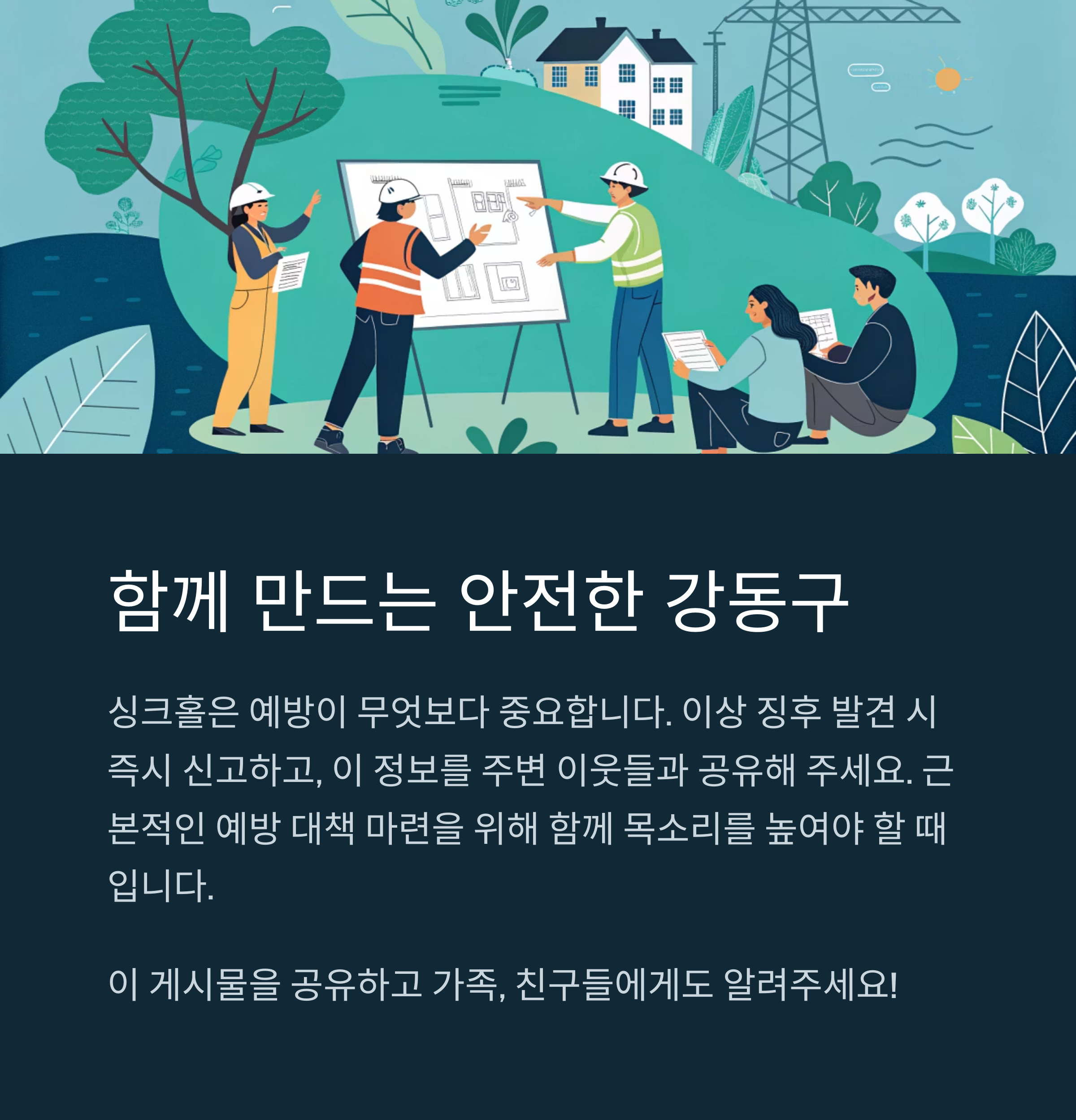 - 시민 대상 싱크홀 전조 증상(도로 균열, 물 고임 등) 신고 활성화