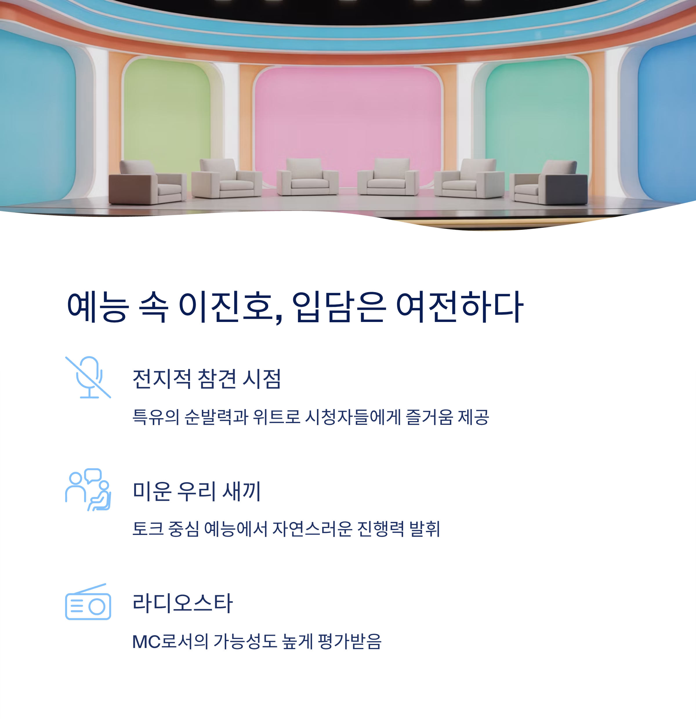 '전지적 참견 시점', '미운 우리 새끼', '라디오스타' 등 토크 중심의 예능에서 특유의 순발력과 위트로 시청자들에게 즐거움을 주었죠.
