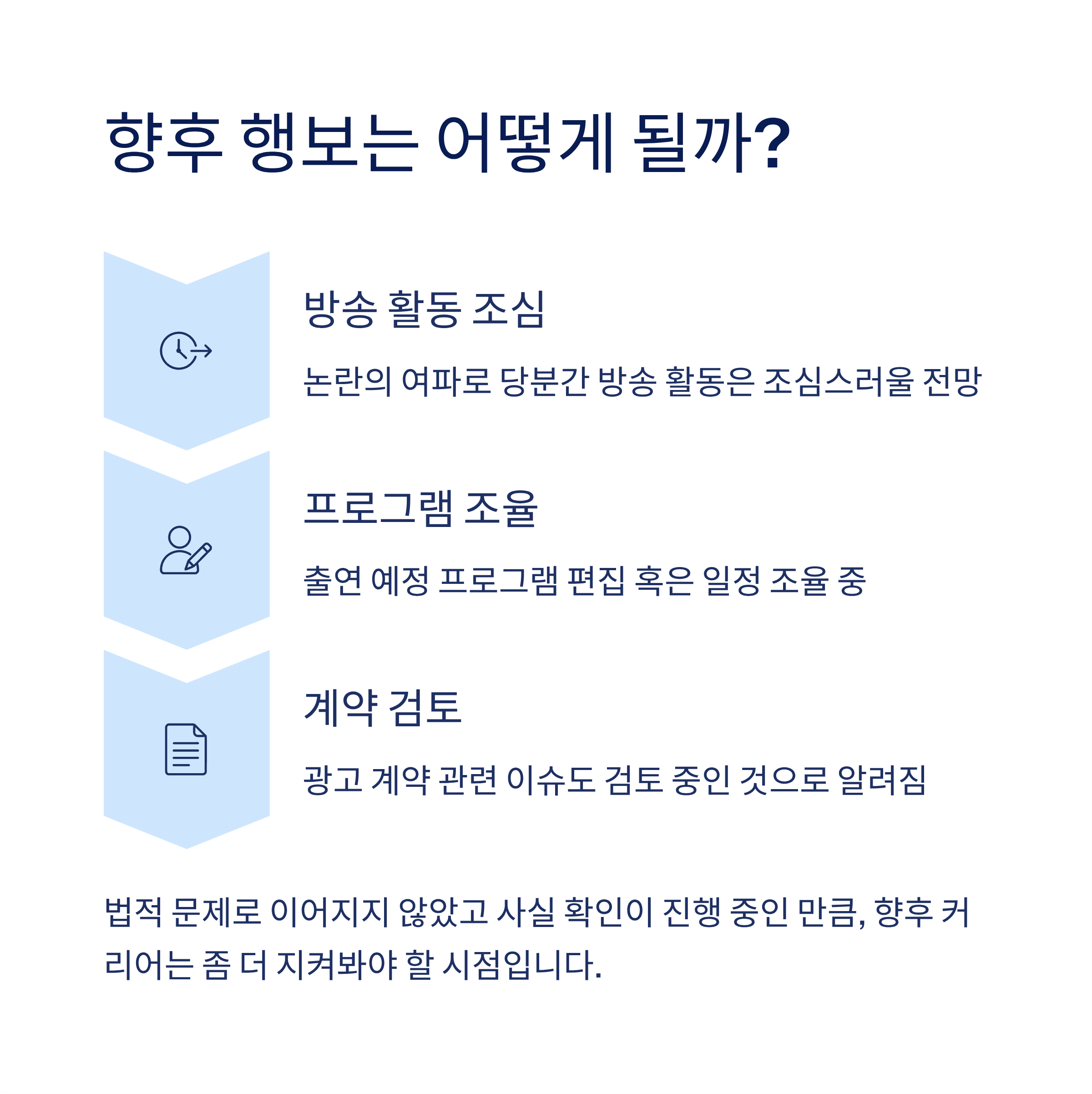 출연 예정이었던 일부 프로그램은 편집 혹은 일정 조율 중인 것으로 전해졌으며, 광고 계약 관련 이슈도 검토 중이라고 알려졌습니다.