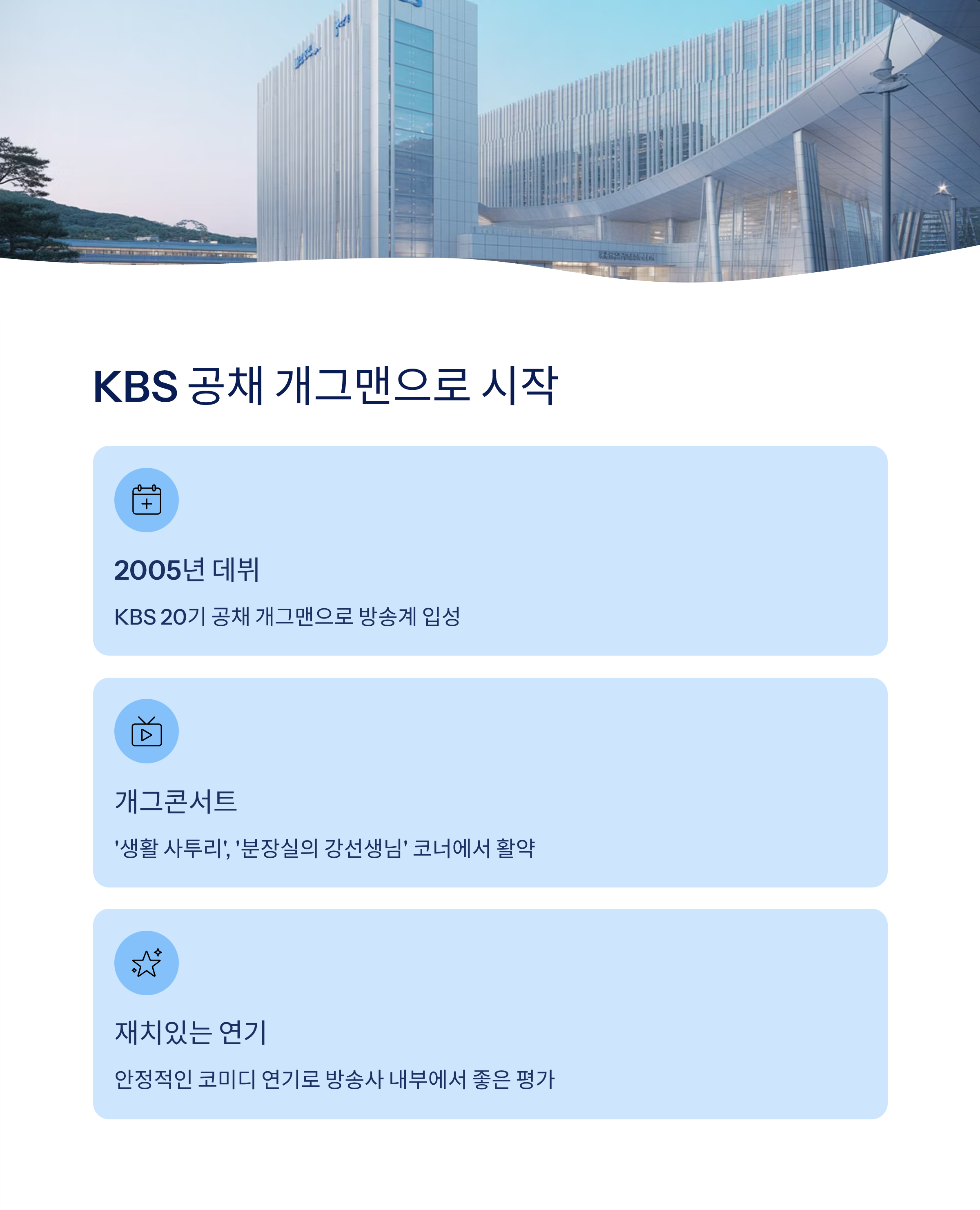 초창기에는 KBS2 '개그콘서트'에서 활동하며 재치 있는 캐릭터 연기로 주목받았고, 특히 '생활 사투리', '분장실의 강선생님' 코너 등에서 활약하며 얼굴을 알리기 시작했죠.