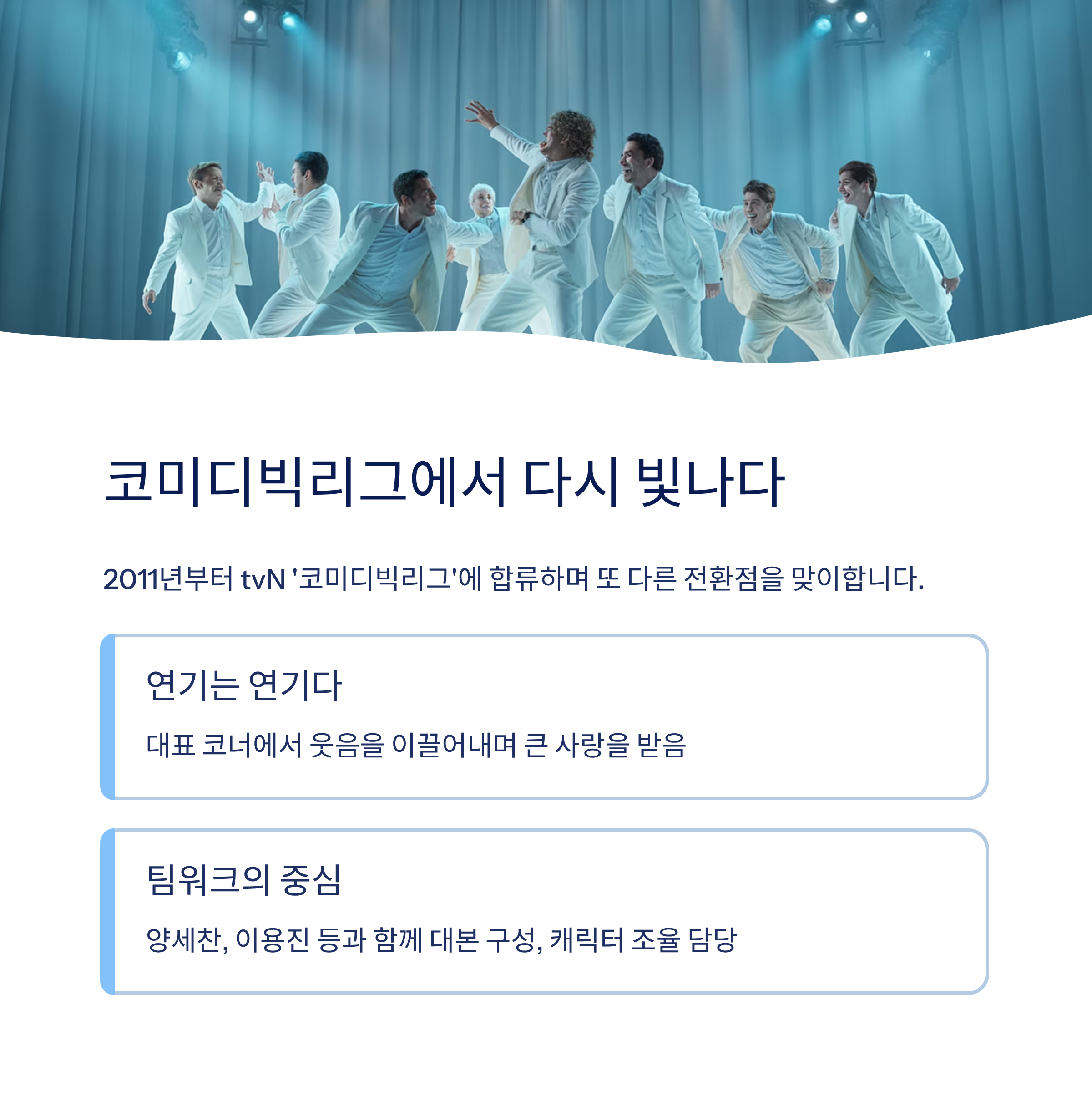 2011년부터는 tvN '코미디빅리그'에 합류하며 또 다른 전환점을 맞이합니다.