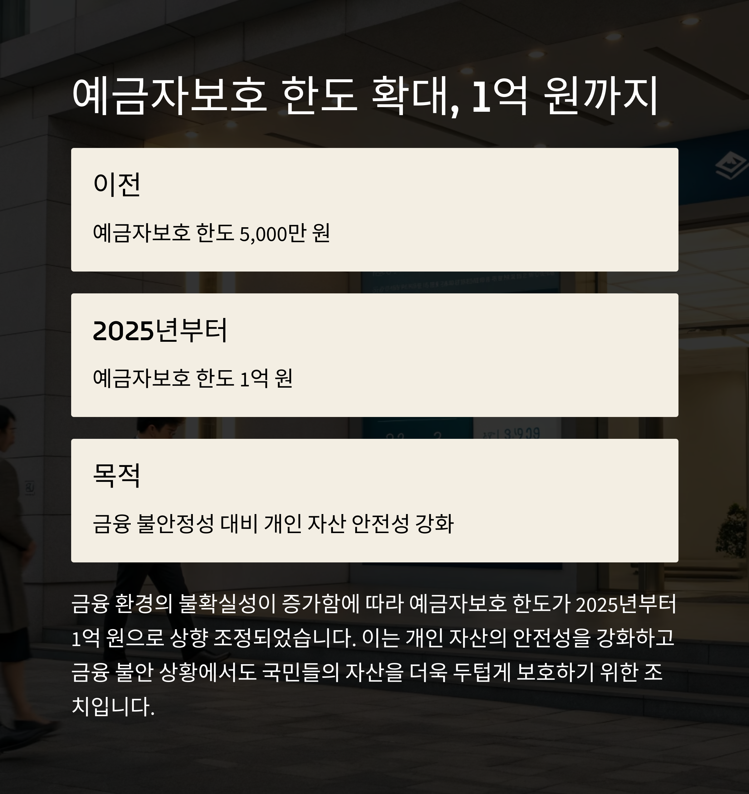더불어, 2025년부터 예금자보호 한도가 5천만 원에서 1억 원으로 상향된 점은 예금의 안정성을 강화하기 위한 정책적 움직임을 보여줍니다.
