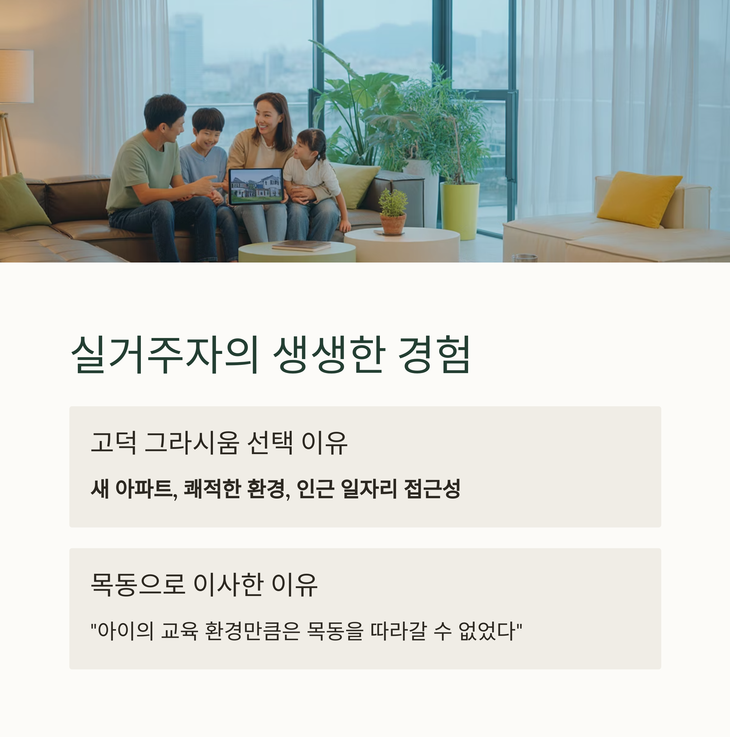 고덕 그라시움을 선택한 이유는 새 아파트, 쾌적한 환경, 인근 일자리 접근성 때문이었습니다.