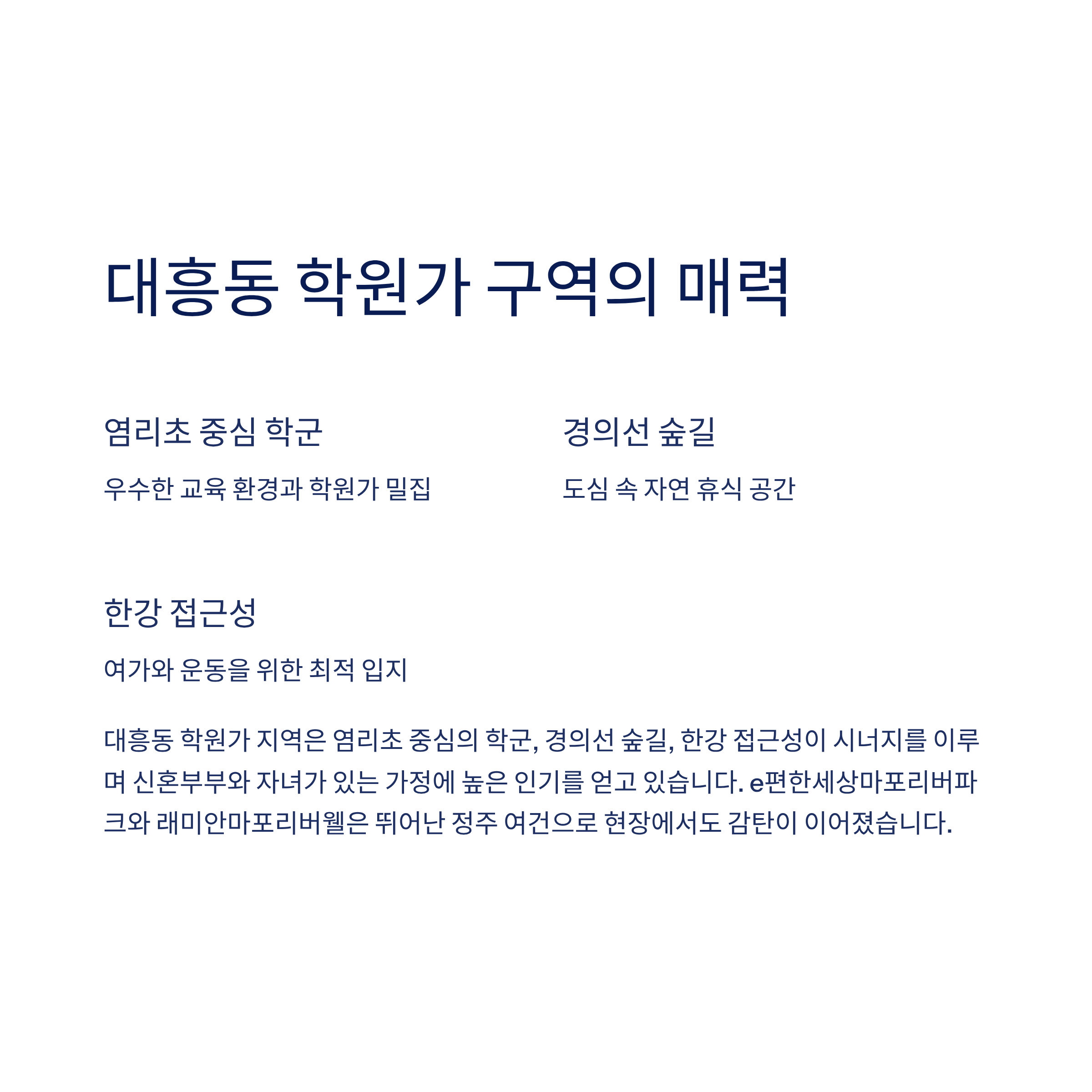 | 대흥동 학원가 | 마포자이1차, e편한세상 | 학군, 평지, 한강 접근성 |