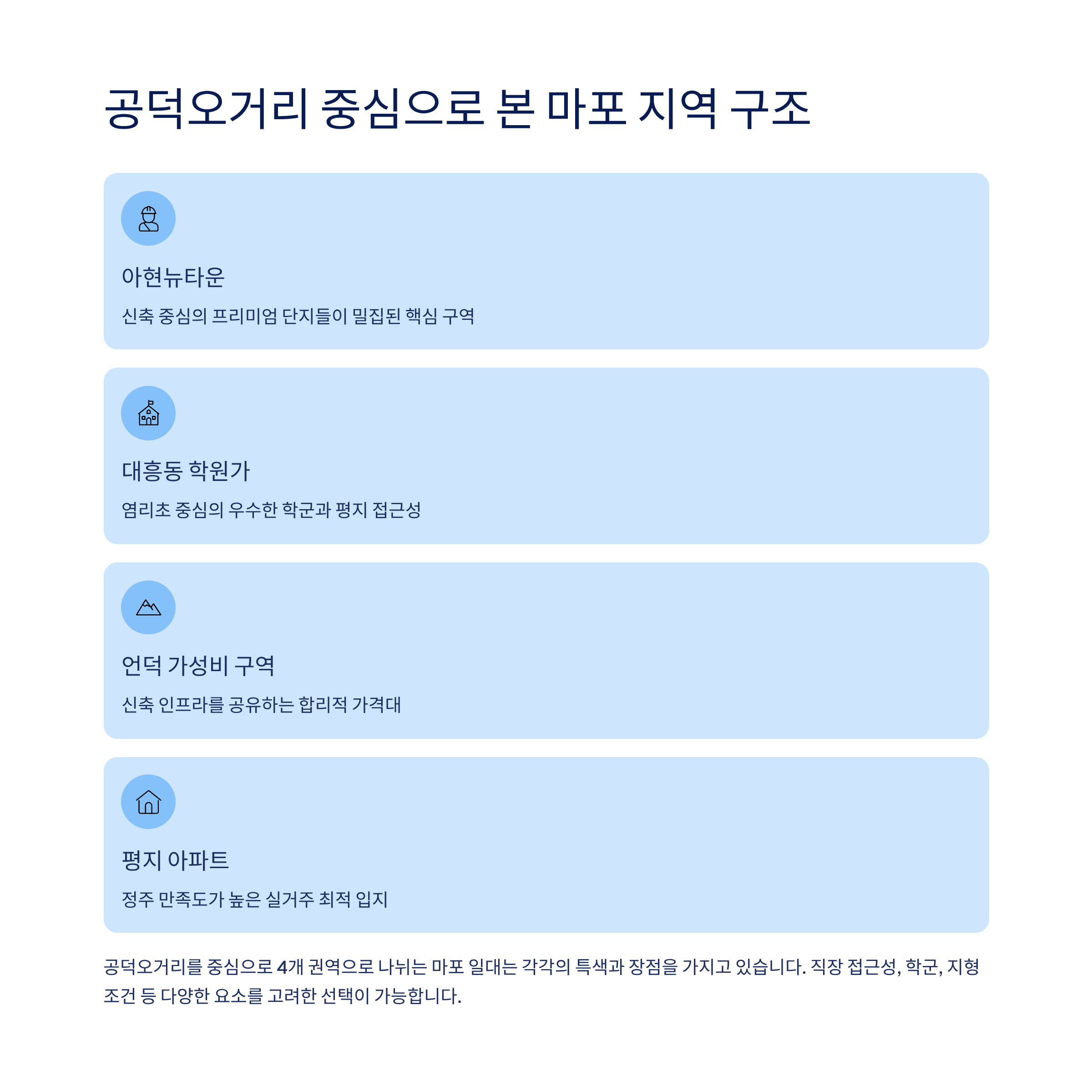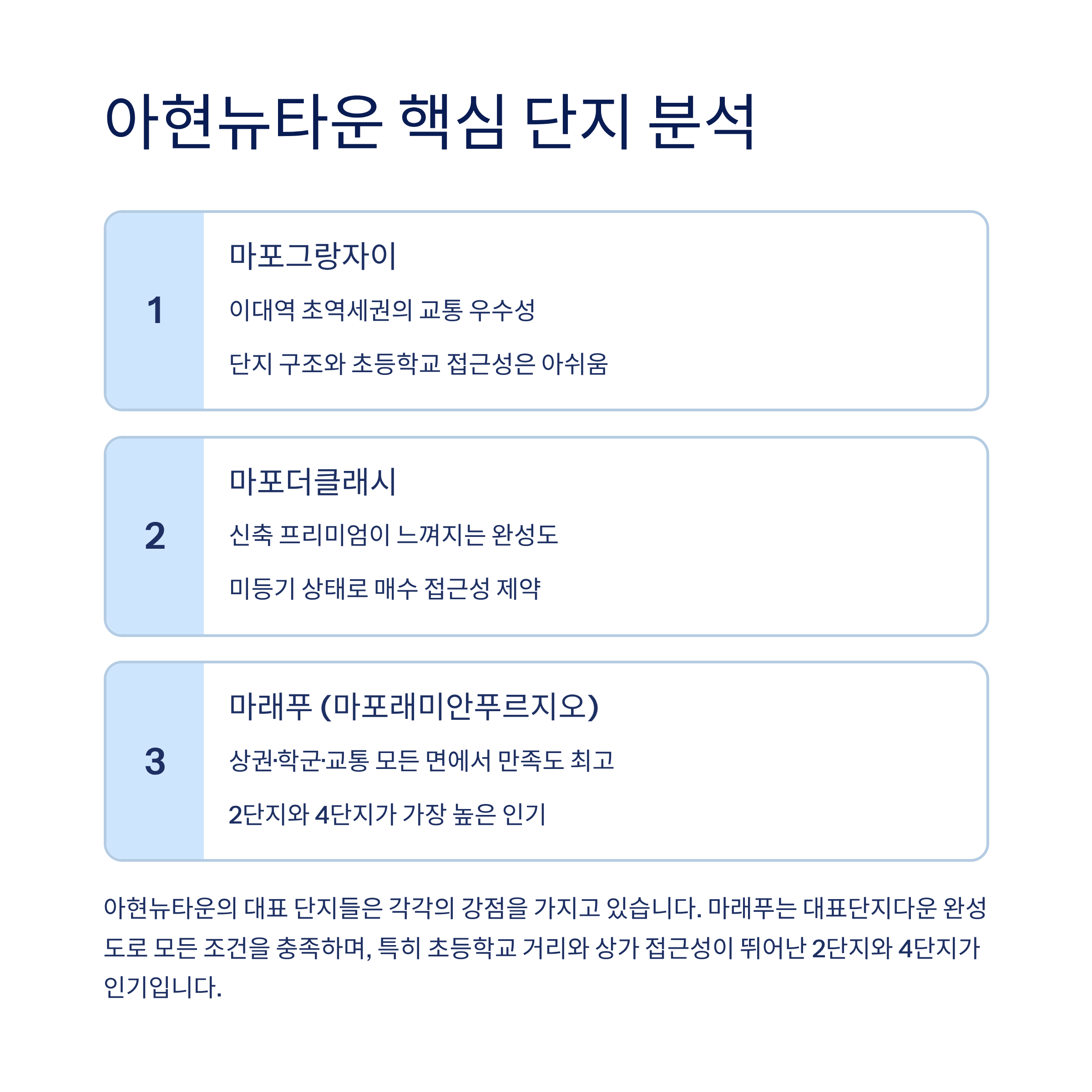 | 아현뉴타운 | 마래푸, 마포더클래시 | 신축 중심, 정주 여건 우수 |