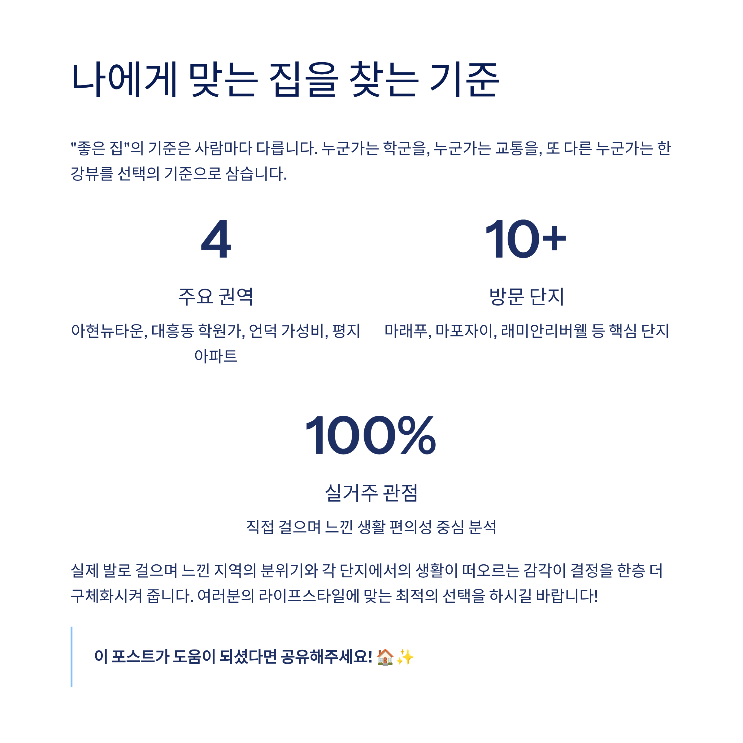 이번 임장을 통해 확실히 느낀 건, "좋은 집"의 기준은 사람마다 다르다는 점입니다. 누군가는 학군을, 누군가는 교통을, 또 다른 누군가는 한강뷰를 선택의 기준으로 삼죠. 실제 발로 걸으며 느낀 지역의 분위기와, 각 단지에서의 생활이 떠오르는 감각이 결정을 한층 더 구체화시켜 줍니다.