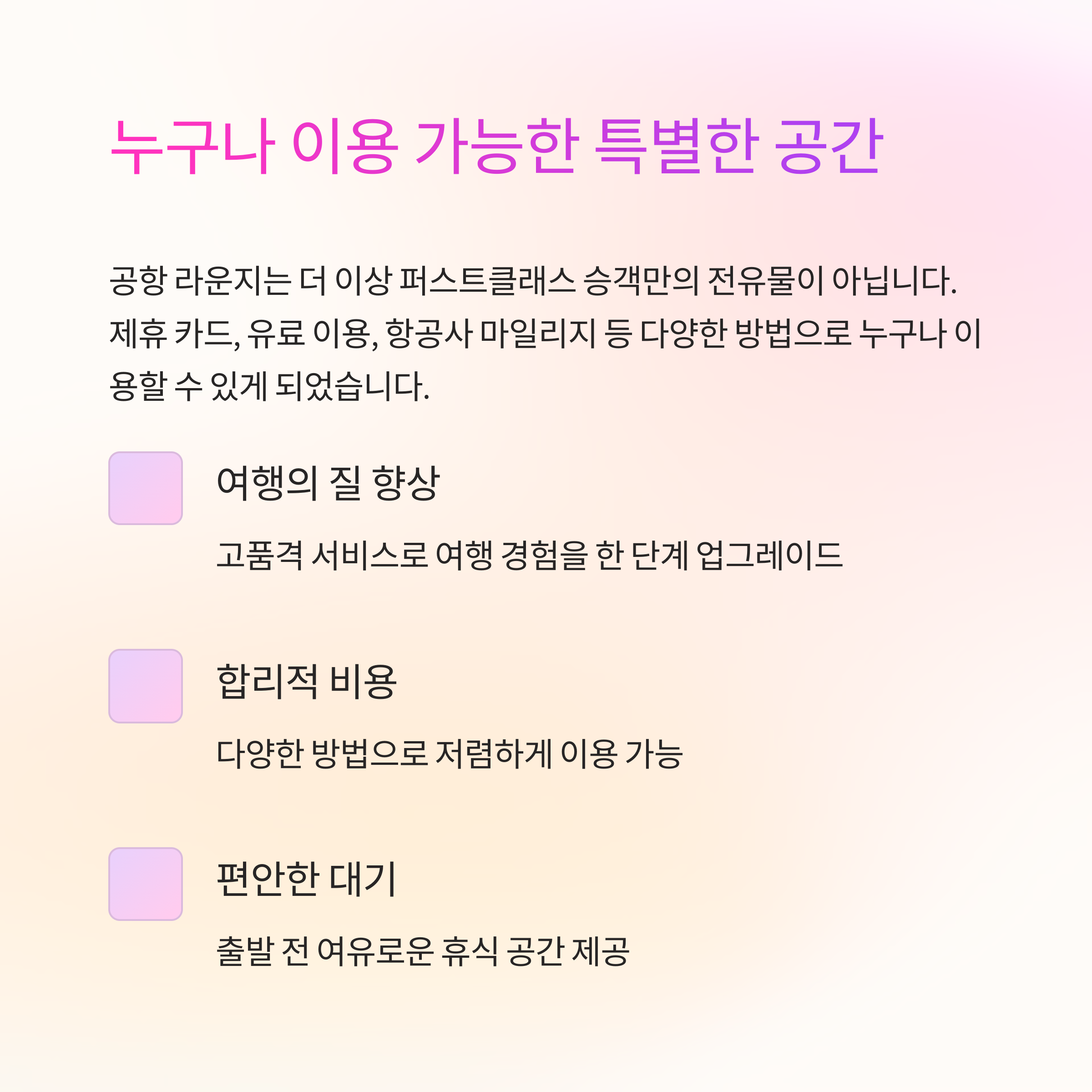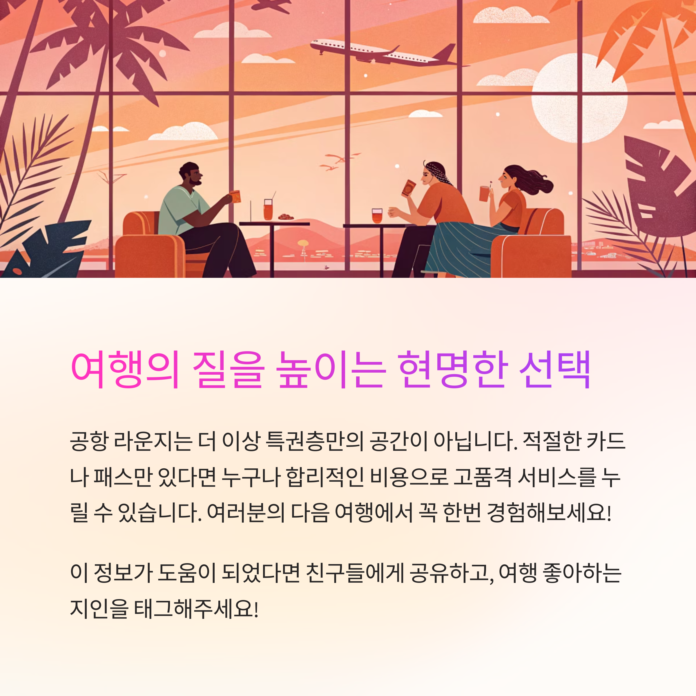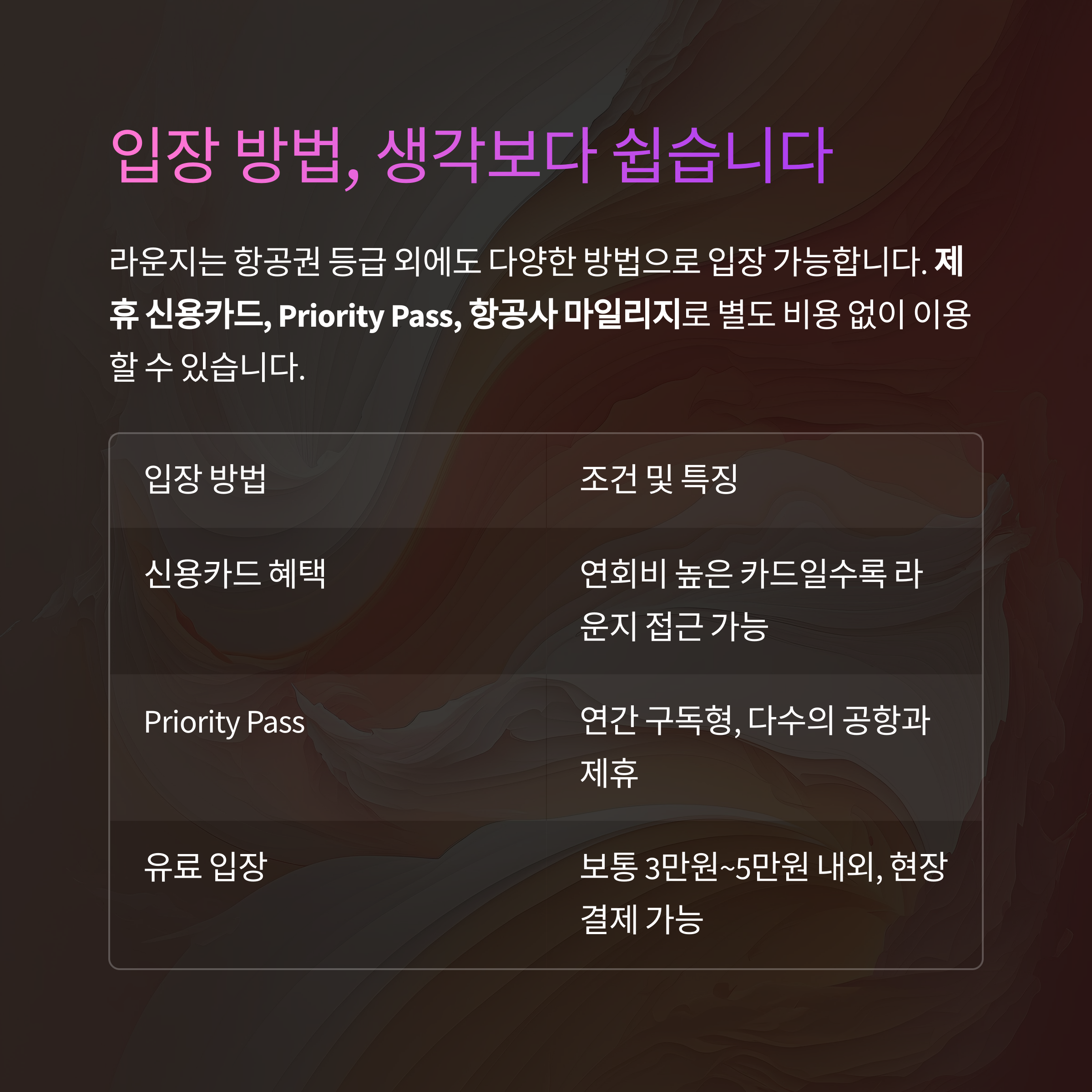 | 신용카드 혜택 | 연회비 높은 카드일수록 라운지 접근 가능 |