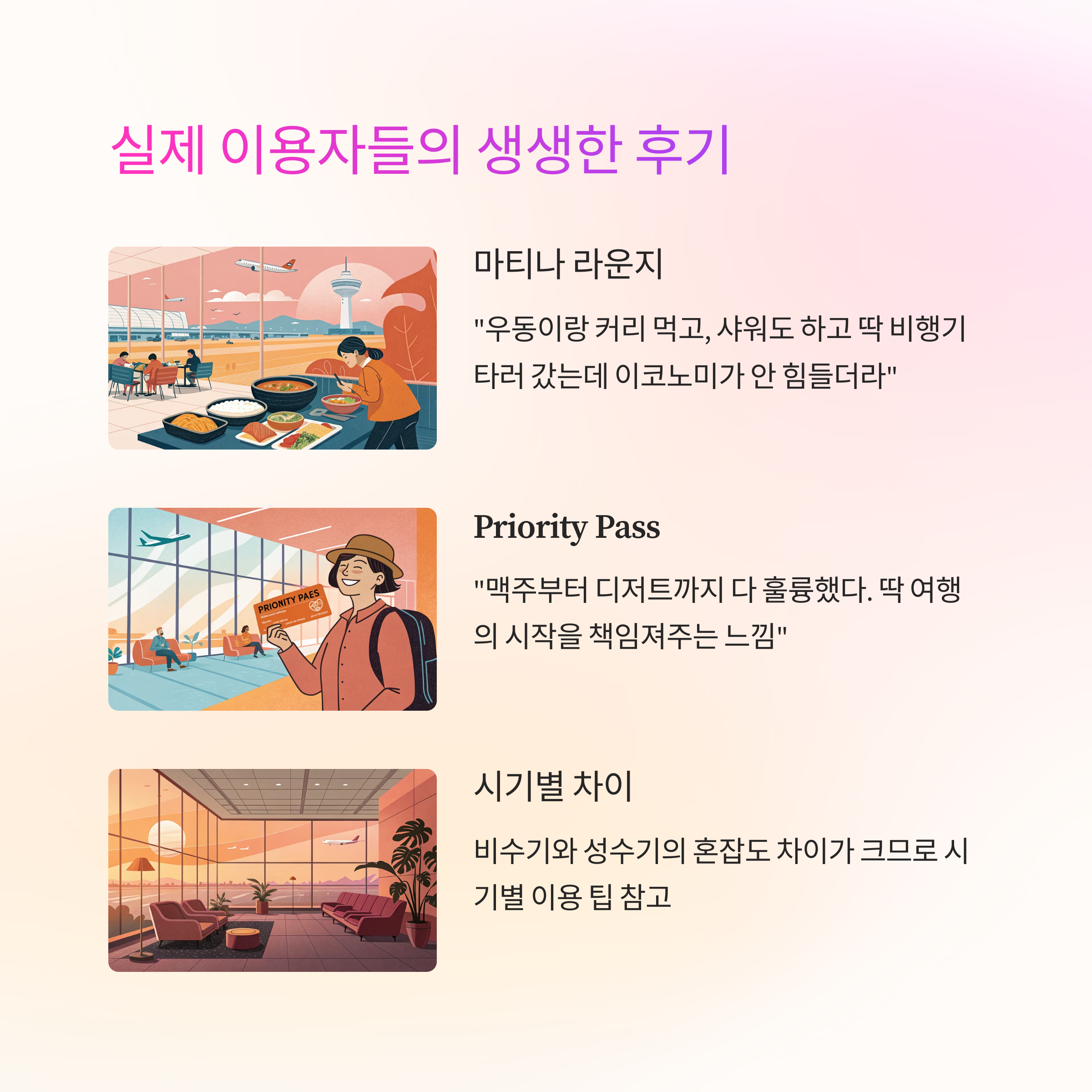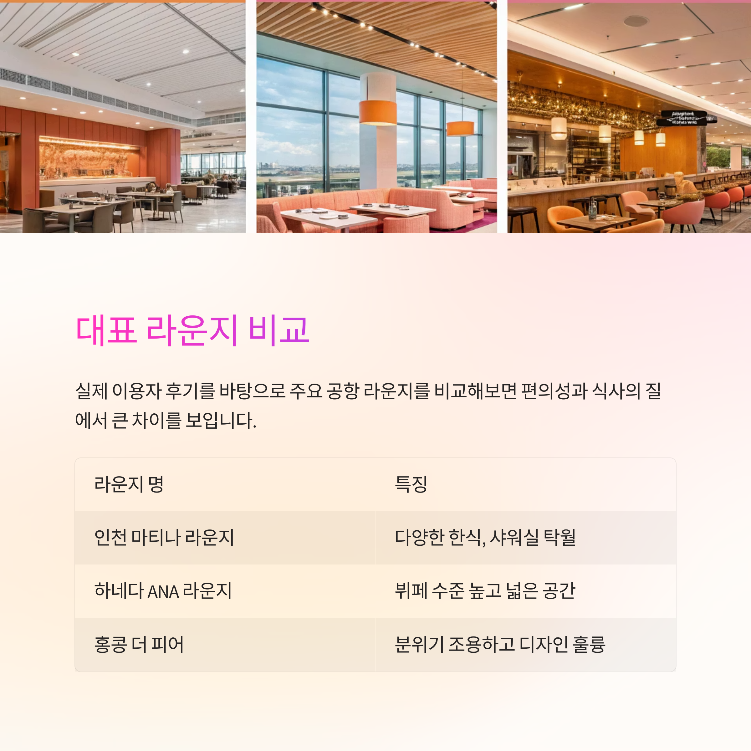 실제 이용자 후기를 바탕으로 주요 공항 라운지를 비교해보면