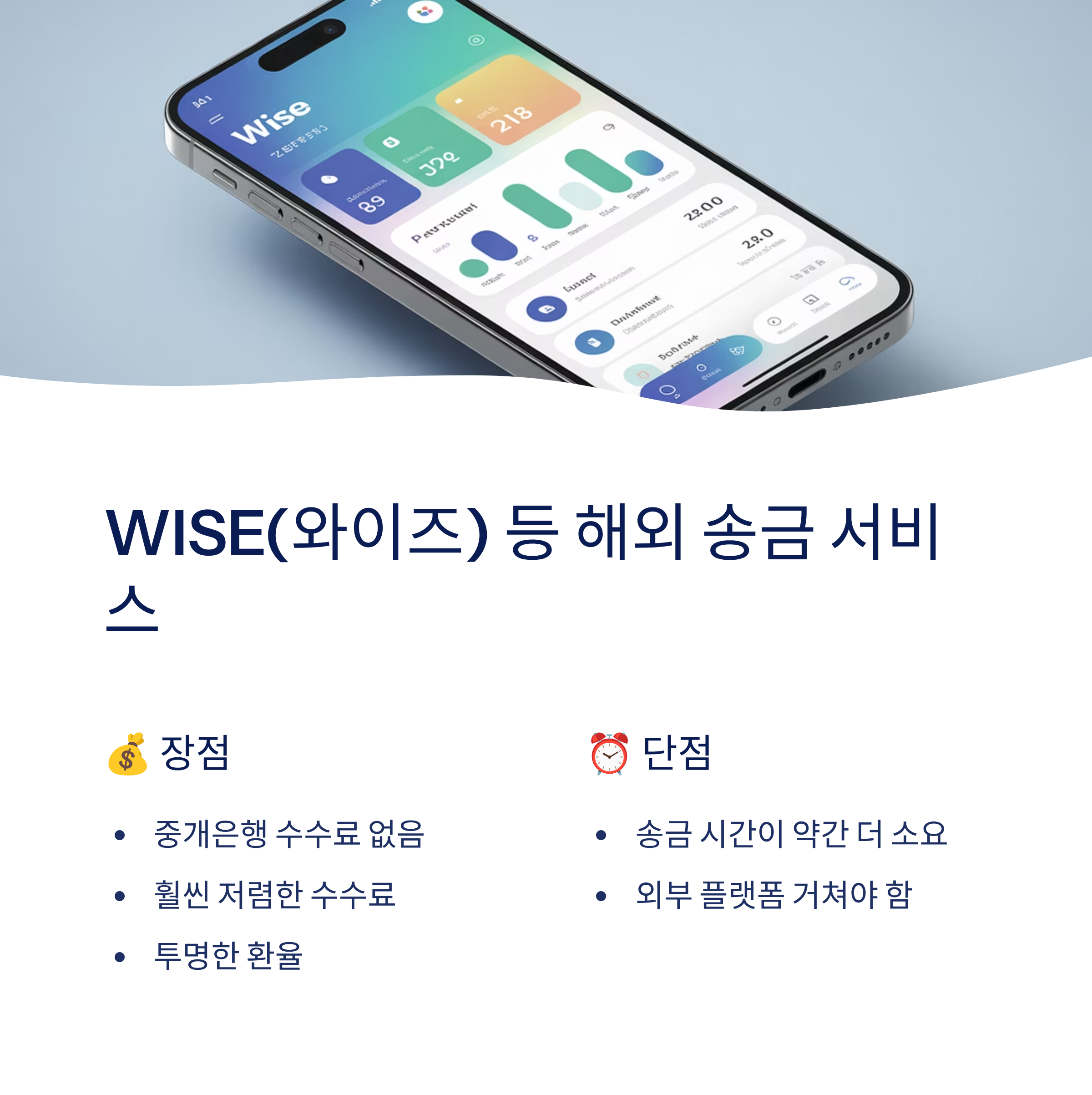 WISE 같은 글로벌 송금 서비스를 이용하면 중개은행 수수료가 없거나 훨씬 저렴하게 설정됩니다. 다만, 은행계좌가 아닌 외부 플랫폼을 거치므로 송금 시간이 약간 더 걸릴 수 있습니다.