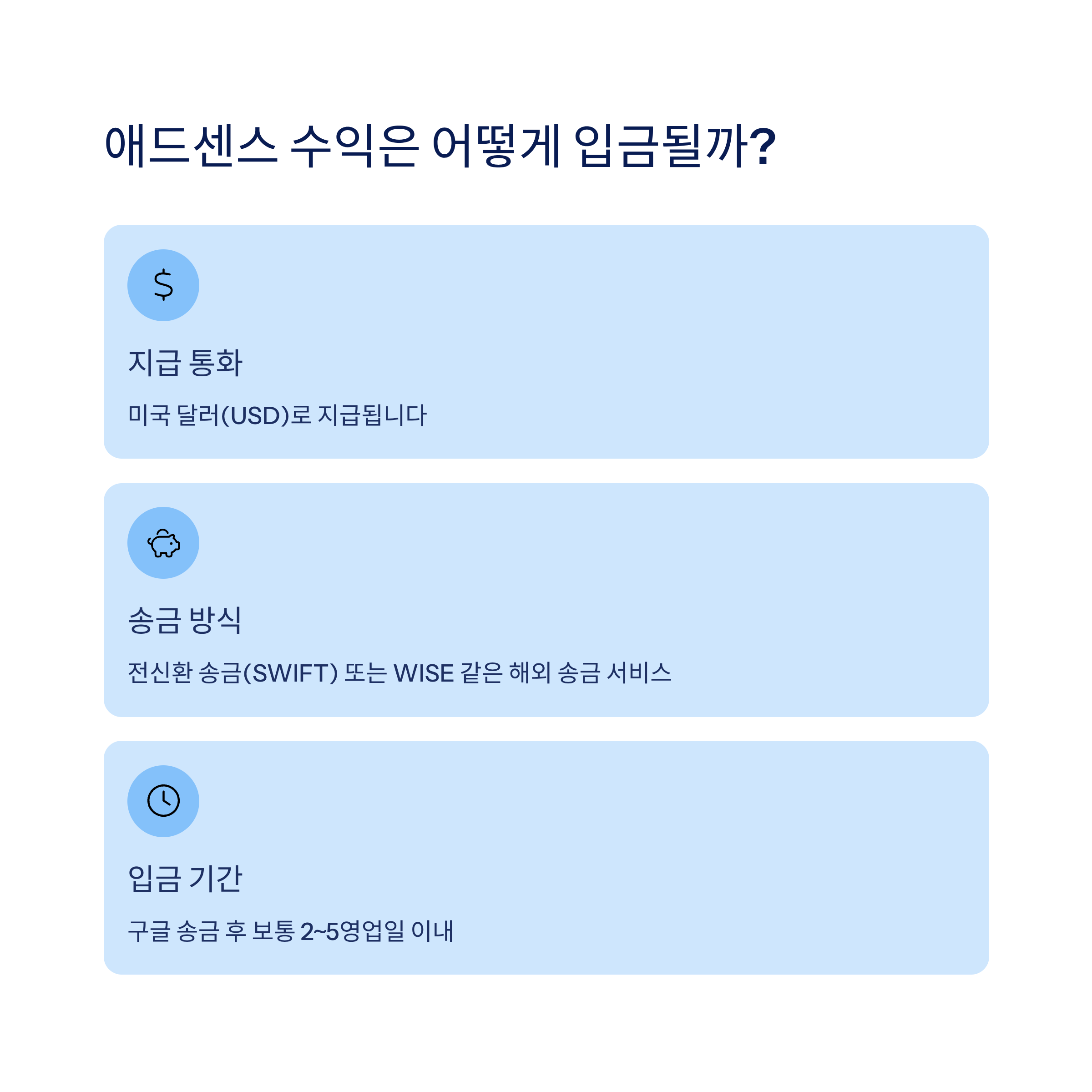 구글 애드센스는 미국 달러(USD)로 지급됩니다. 지급 방식은 두 가지로 나뉘는데, ‘전신환 송금(SWIFT)’ 방식과 ‘WISE(와이즈)’ 같은 해외 송금 서비스가 대표적입니다. 대부분 국내 은행 계좌로 직접 송금받는 경우가 많으며, 구글에서 송금 후 보통 2~5영업일 이내에 입금됩니다.
