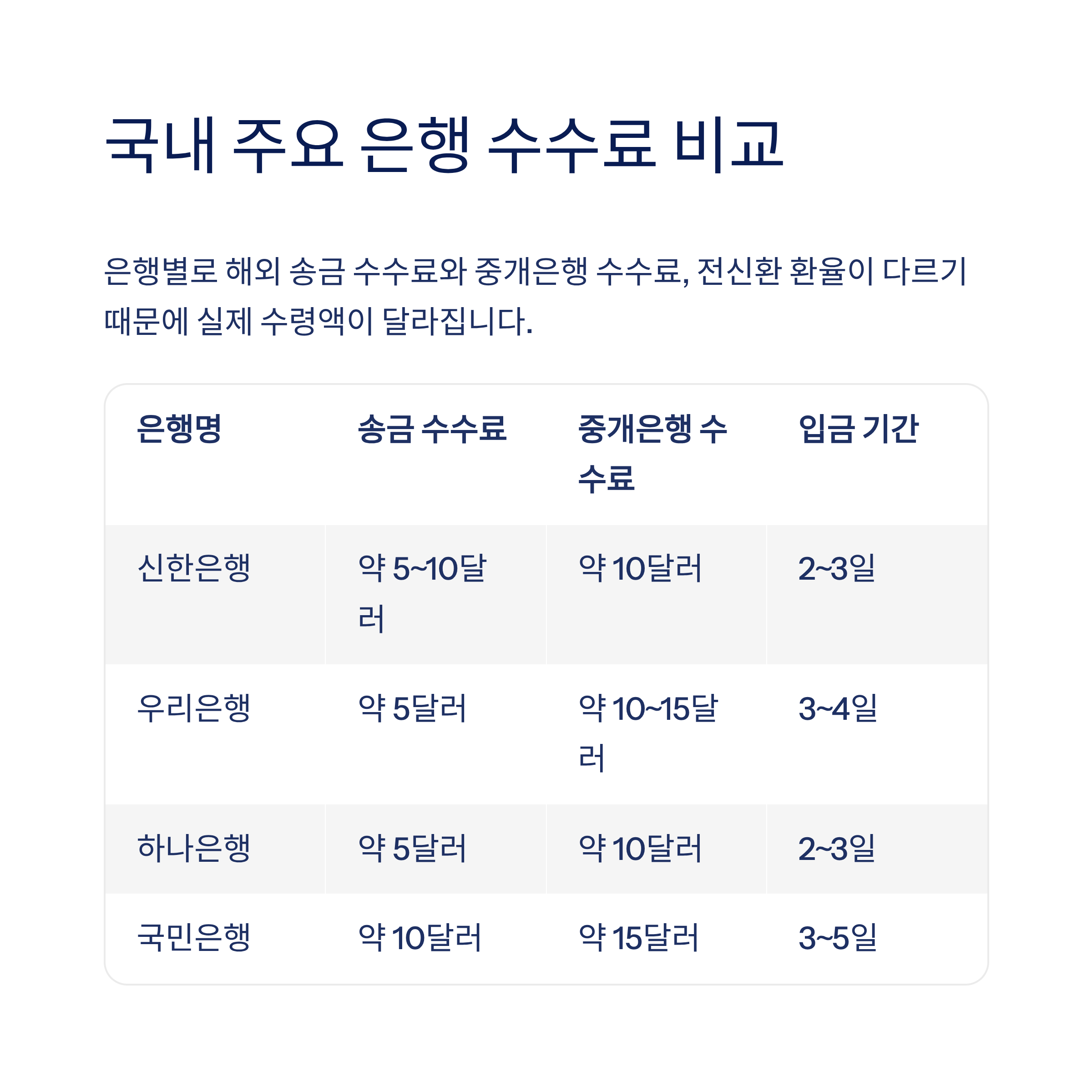 은행별로 해외 송금 수수료와 중개은행 수수료, 전신환 환율이 다르기 때문에 실제 수령액이 달라집니다. 아래 표는 주요 시중은행의 평균적인 수수료 범위를 정리한 예시입니다.