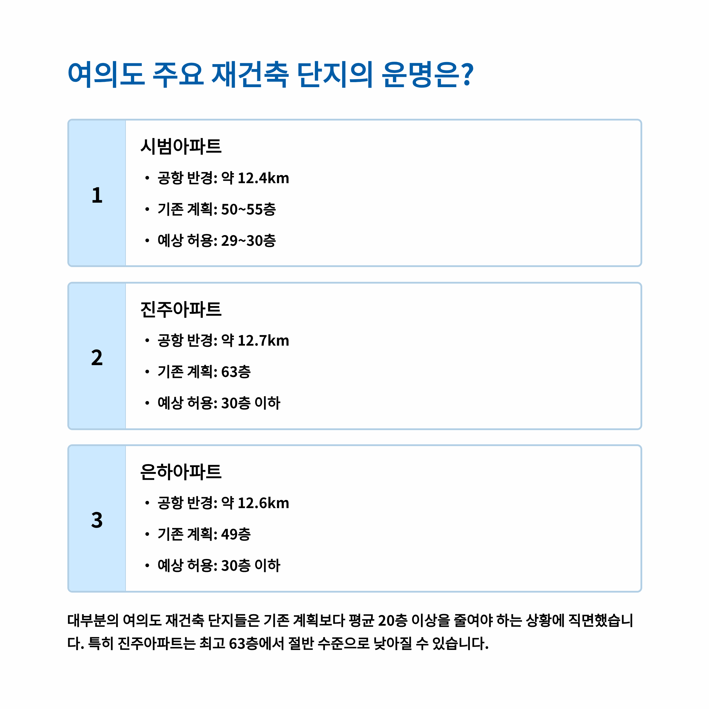 국제민간항공기구(ICAO)가 2025년 8월 4일부터 전 세계 공항 반경 내 건축물의 높이를 제한하는 새로운 고도 기준을 발표하면서, 서울 여의도를 포함한 인근 지역의 재건축 사업에 큰 변화가 예고되고 있습니다. 김포공항에 인근에 위치한 여의도 지리적 특성상 63층 규모의 초고층 재건축 계획은 대대적인 수정이 불가피할 것으로 보입니다. 이 글에서는 여의도와 그 주변 재건축 단지들의 고도제한 적용 가능성과 예상 재건축 높이를 정리했습니다.