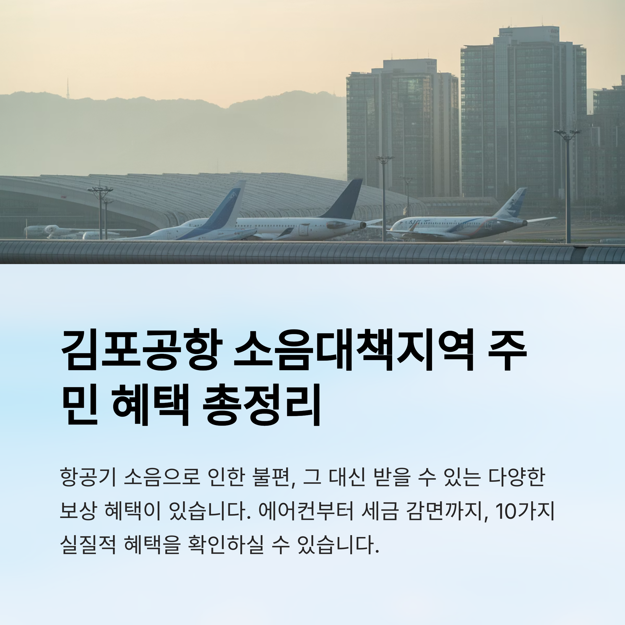 서울 김포공항 인근 소음대책지역에 거주하는 주민들은 주거환경 개선과 삶의 질 향상을 위한 다양한 지원 혜택을 받을 수 있습니다. 에어컨 지원부터 전기료 감면, 세금 혜택, 방음시설 지원까지 항공기 소음으로 인한 불편을 보완하기 위한 복지제도가 마련되어 있습니다. 이 글에서는 서울 김포공항 소음대책지역에 거주할 경우 실제로 받을 수 있는 혜택과 신청 방법, 지역별 차이를 상세히 정리해드립니다.