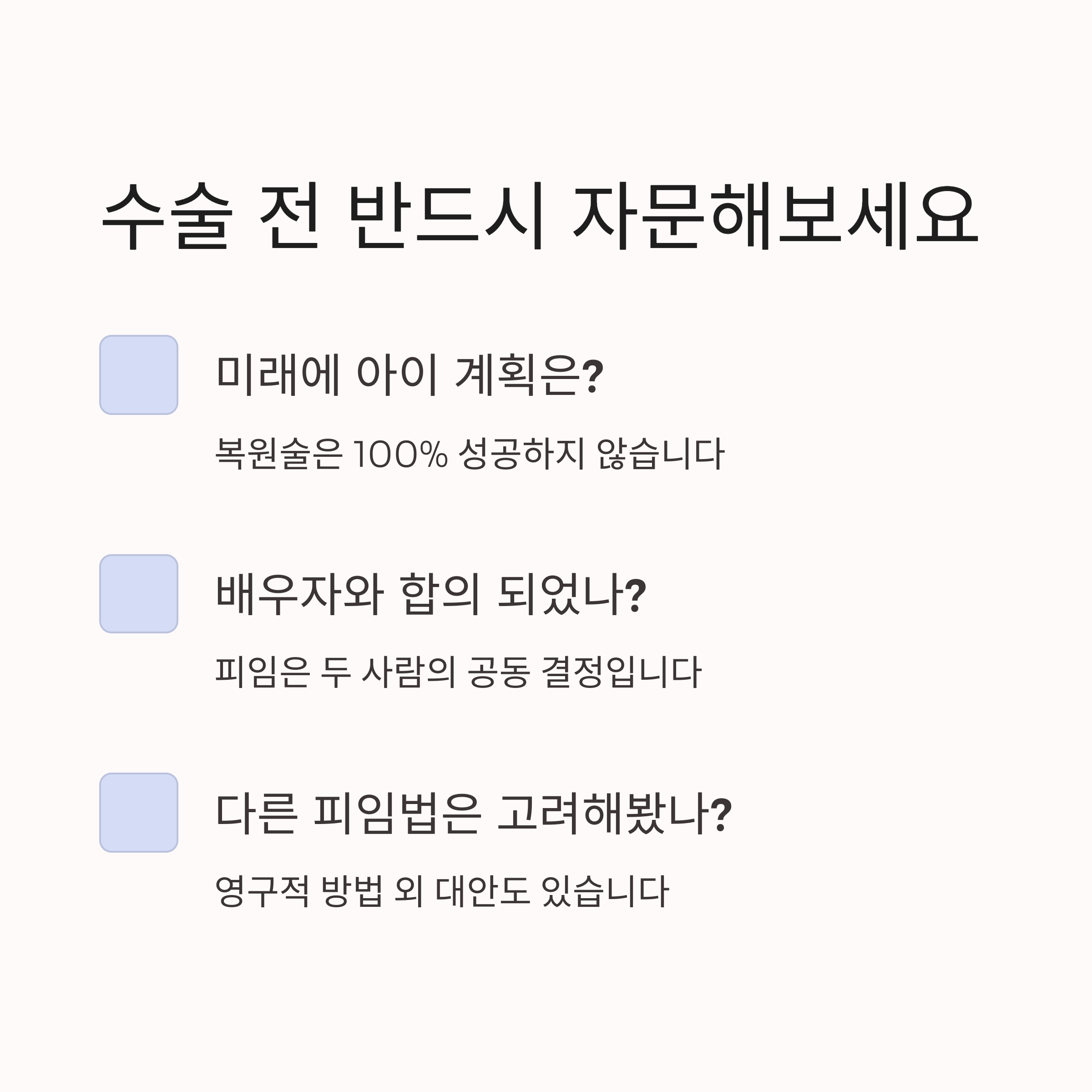 | 사후관리 | 수술 후 정자검사 포함 여부 확인 |