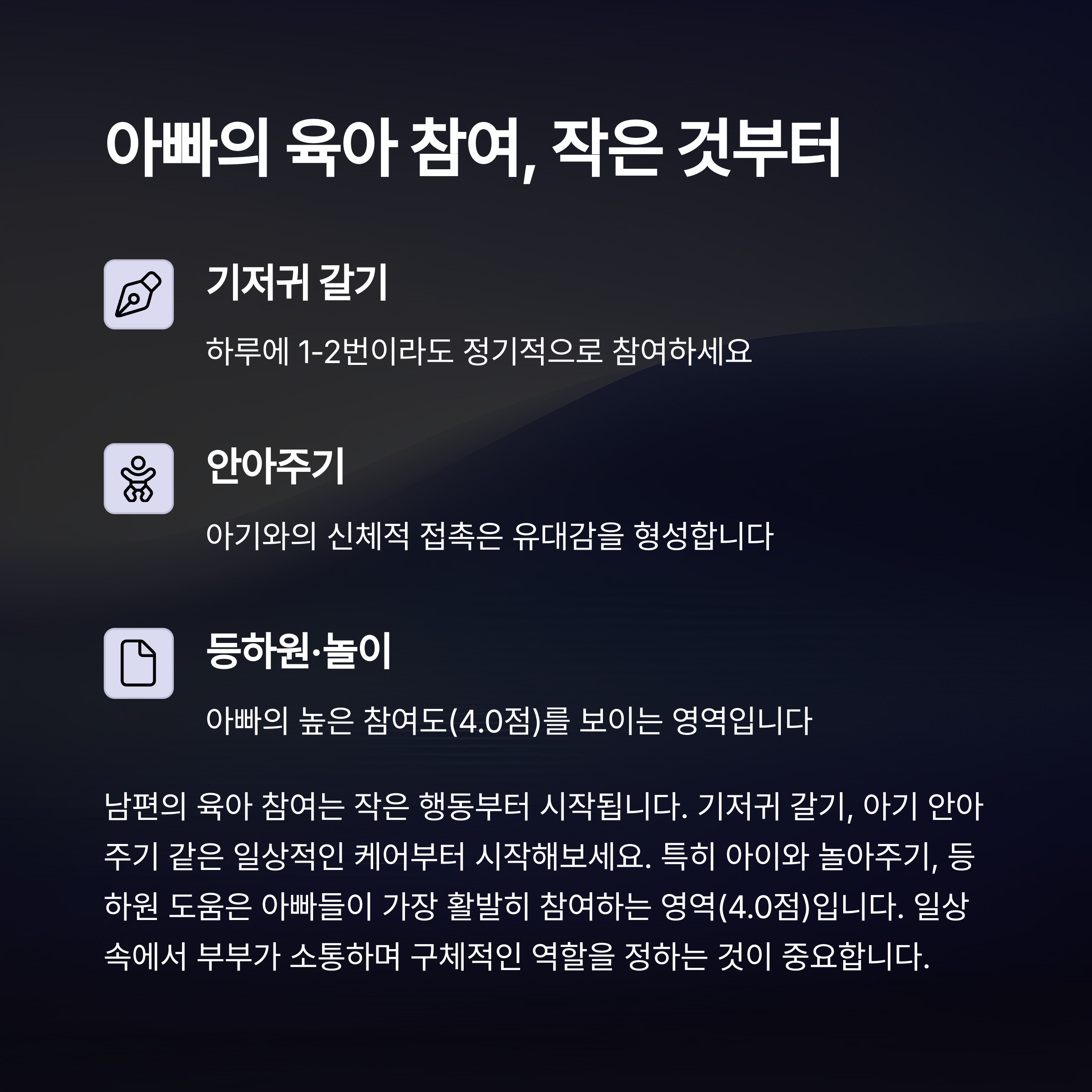 따라하기 쉬운 기저귀 갈기, 아기 안아주기부터 시작하세요! 매일 서로의 상호 존중을 통해 분담을 점진적으로 늘려보세요.
