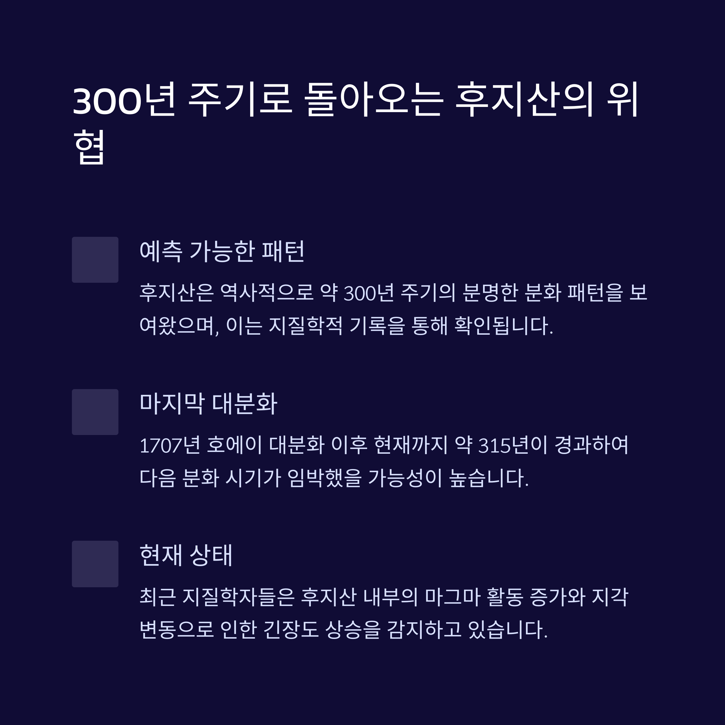 후지산은 지난 1707년 호에이 분화 이후 300년 넘게 휴면 상태를 유지하고 있습니다. 그러나 화산학자들은 이런 장기간의 휴면이 오히려 대규모 폭발의 전조가 될 수 있다고 경고합니다. 역사적으로 후지산은 200~300년 주기로 폭발했으며, 현재는 그 주기를 넘어서고 있는 상황입니다.