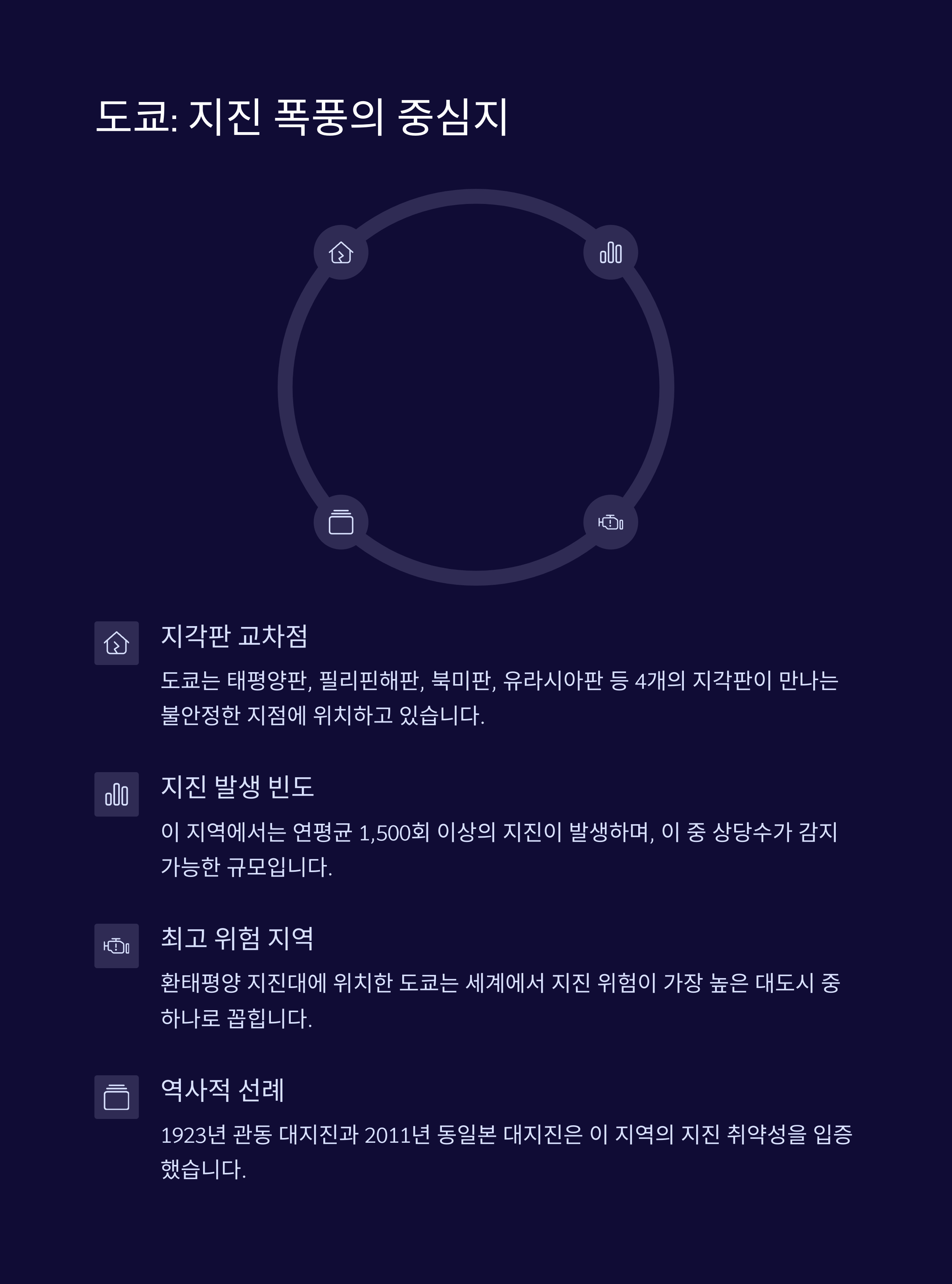 일본은 환태평양 불의 고리에 위치한 나라로, 지질학적으로 매우 불안정한 지역에 자리잡고 있습니다. 특히 일본의 상징인 후지산은 활화산으로 분류되어 있으며, 도쿄는 여러 지진대가 교차하는 지점에 위치해 있습니다. 이런 지질학적 특성은 일본을 세계에서 자연재해 위험이 가장 높은 국가 중 하나로 만들었습니다.