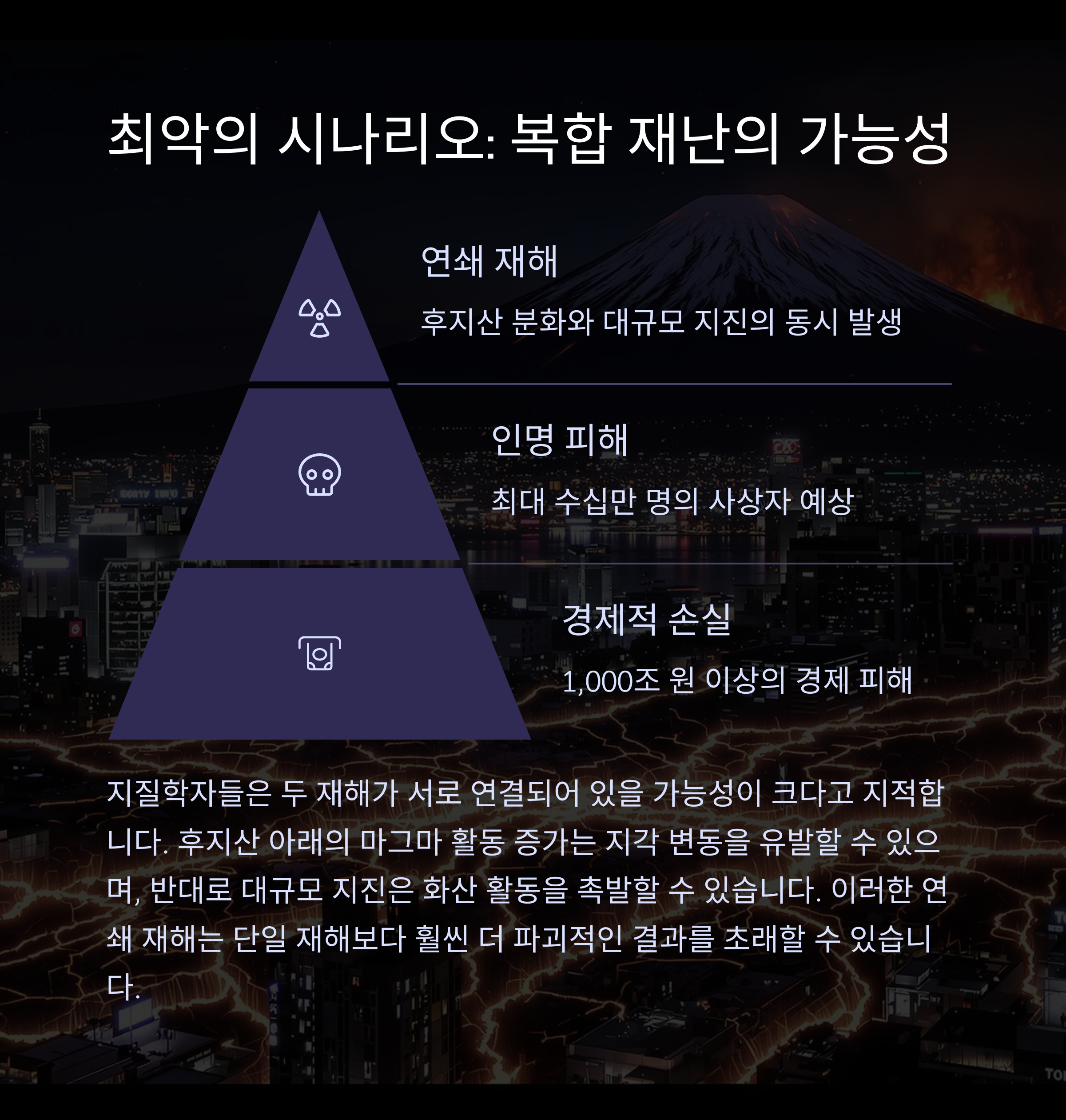 지질학적으로 화산 활동과 지진은 밀접한 관계가 있습니다. 후지산 폭발은 지각 응력 변화를 일으켜 도쿄 지역 단층의 지진 발생 확률을 높일 수 있습니다. 반대로 도쿄 인근에서 대지진이 발생하면 후지산의 마그마 활동을 자극해 폭발로 이어질 가능성도 있습니다.