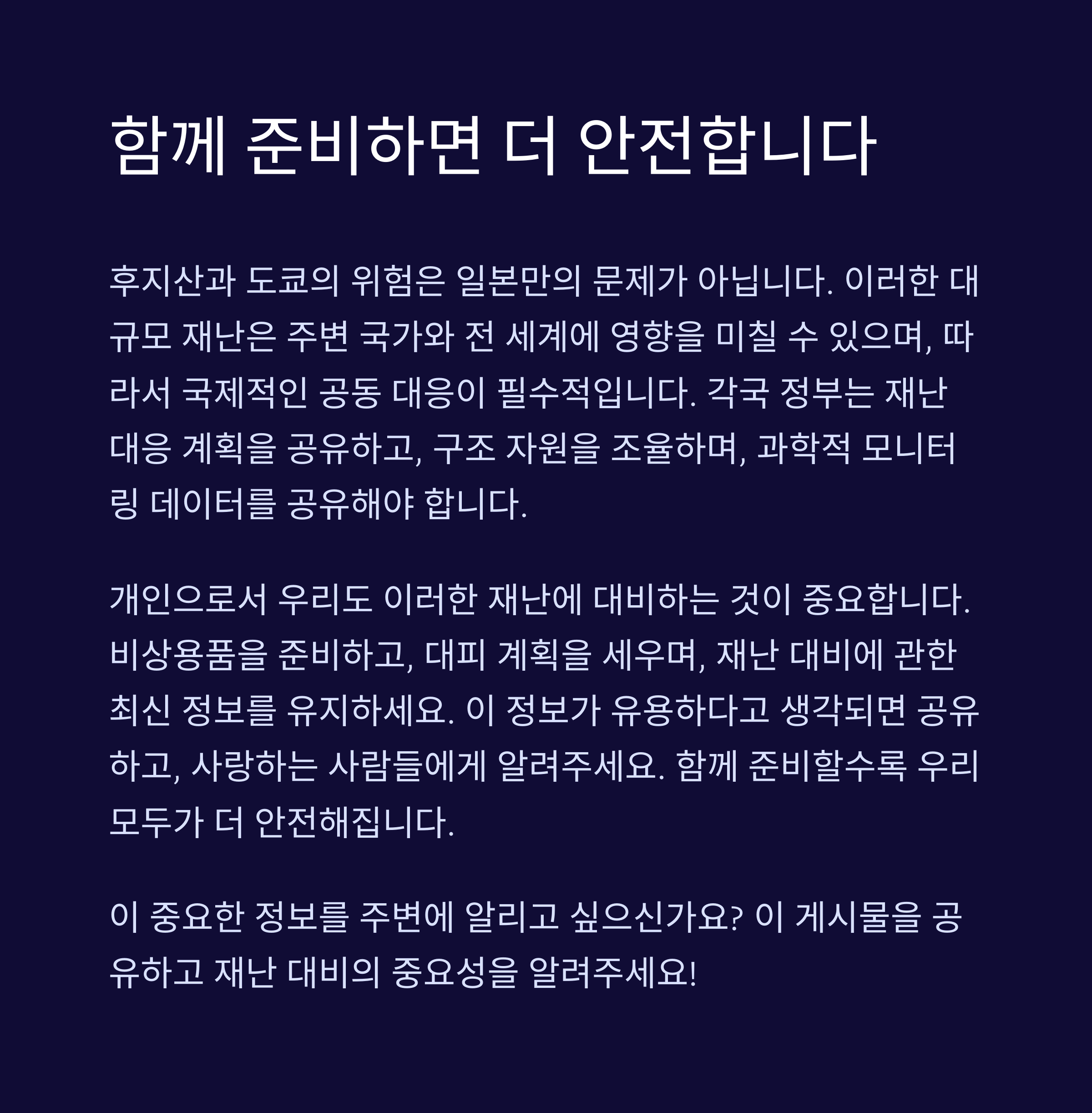 후지산 폭발과 도쿄 대지진은 '언제 일어날지 모르는 것'이 아니라 '언제 일어나도 이상하지 않은' 재난입니다. 역사적 데이터와 과학적 분석은 이러한 재난이 발생할 확률이 점점 높아지고 있음을 보여줍니다.
