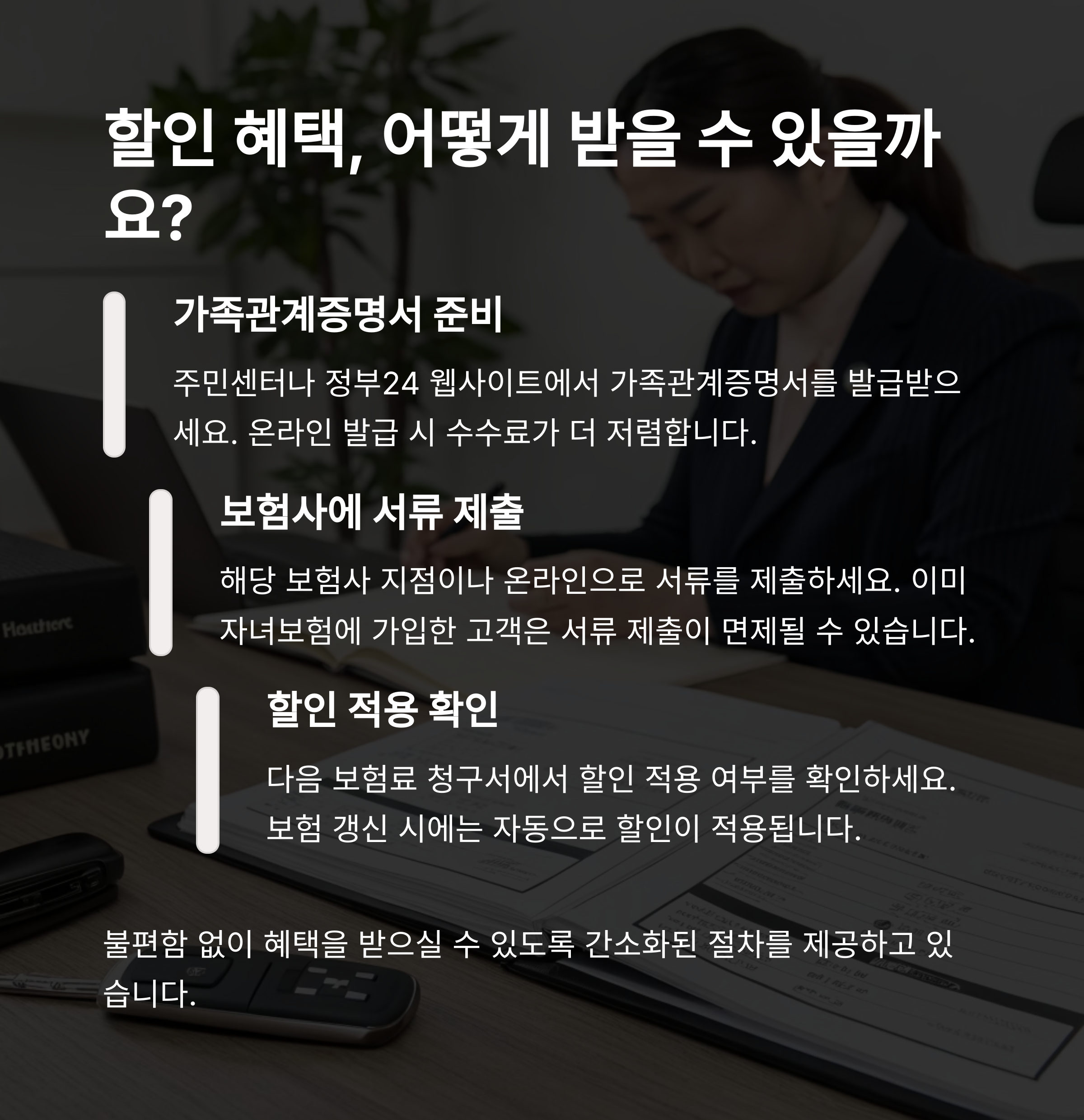 다자녀 자동차 보험 할인을 받기 위한 신청 방법은 매우 간단합니다. 일반적으로는 자동차 보험 가입 시점에 함께 신청하면 되며, 갱신 시에도 추가로 할인 신청이 가능합니다.