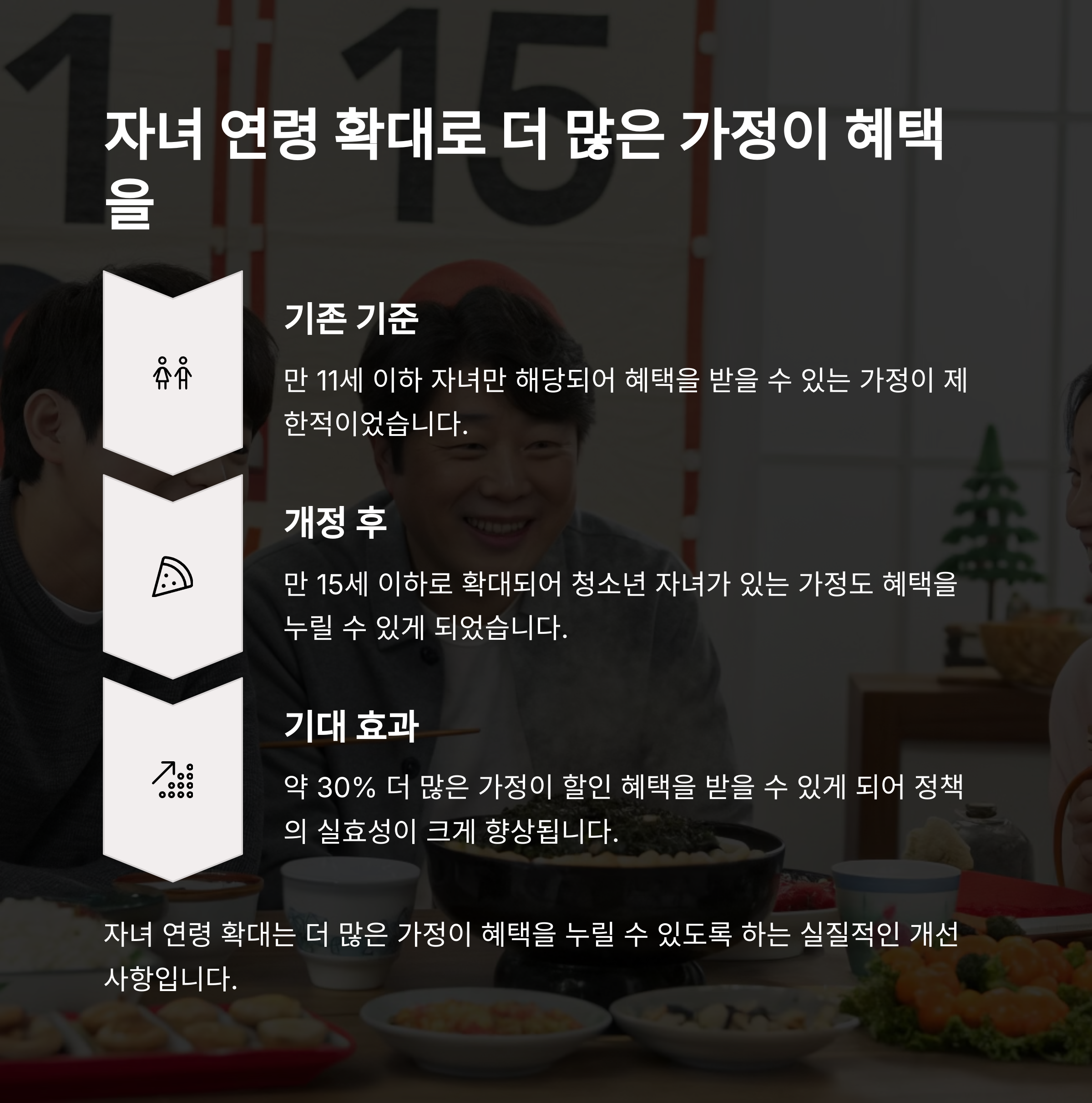 - 문화/여가 지원: 영화관, 놀이공원, 공연장 등에서 가족 단위 할인