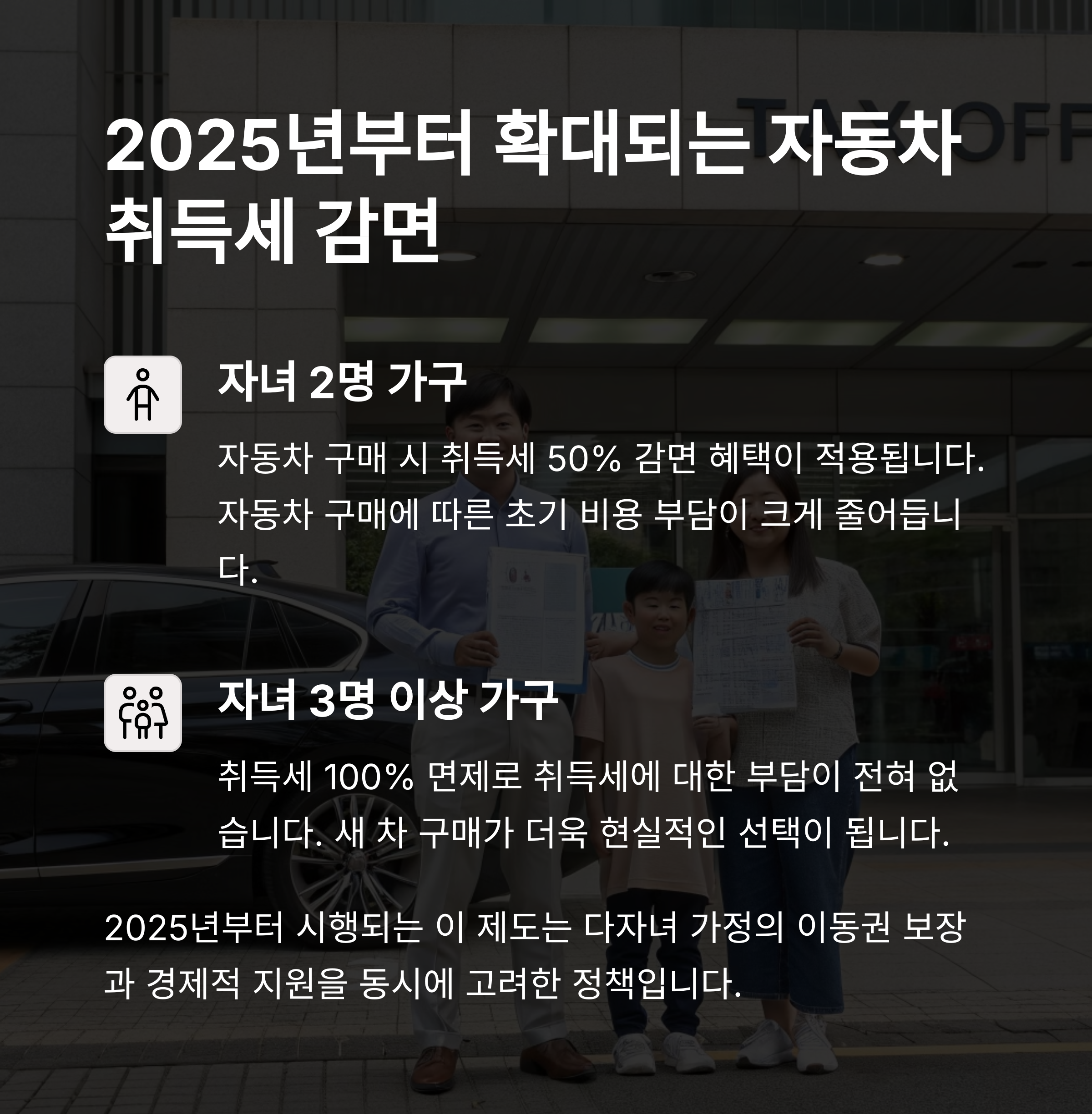 - 자동차 취득세 면제: 3자녀 이상 다자녀 가정은 1회에 한해 차량 구입 시 취득세가 면제됨