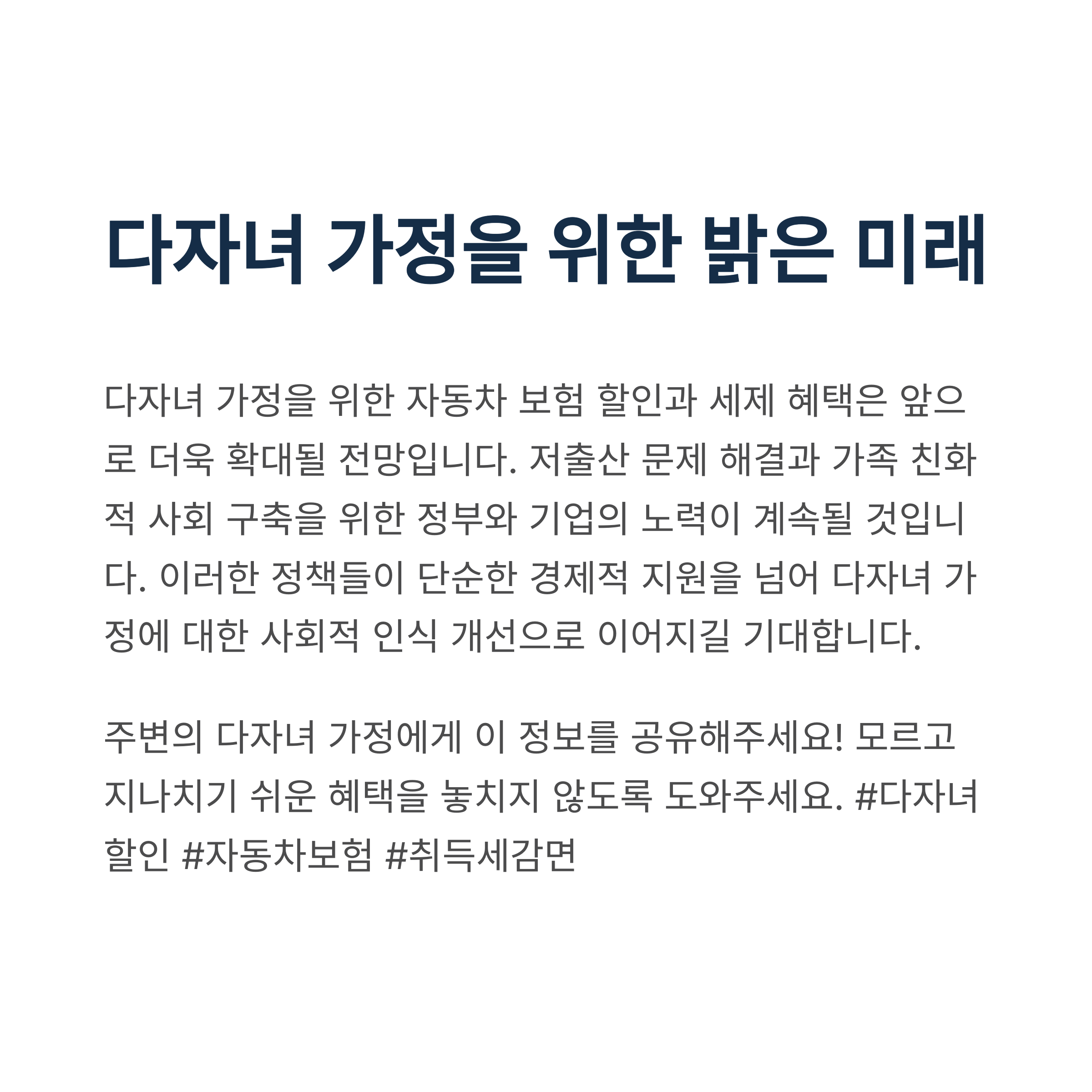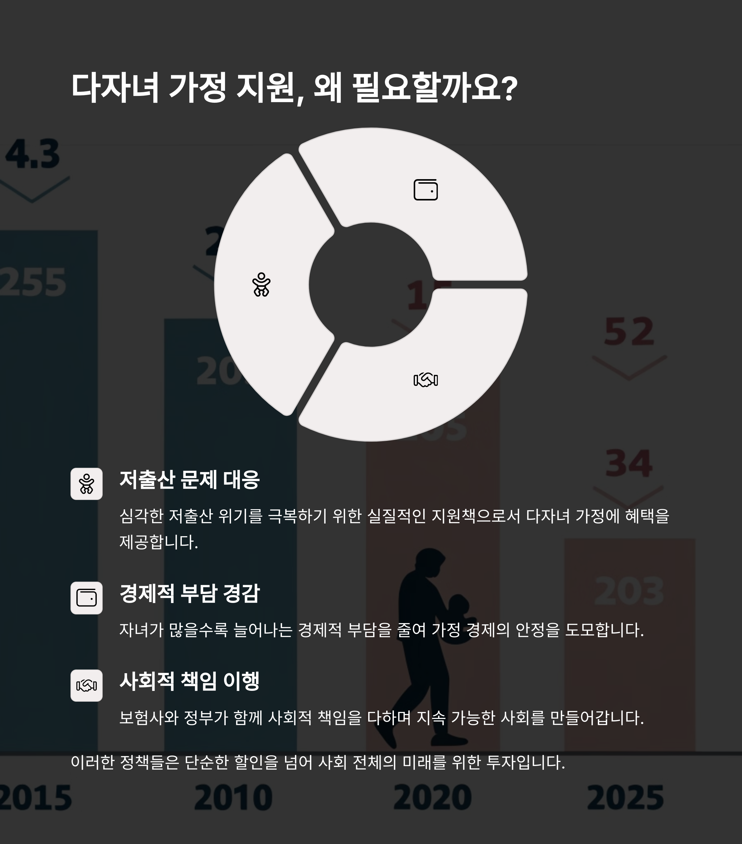 이처럼 다자녀 가정을 위한 정책은 정부와 민간 기업이 함께 진행 중이며, 보험료뿐 아니라 생활비 전반에 걸쳐 절감 효과를 누릴 수 있습니다.