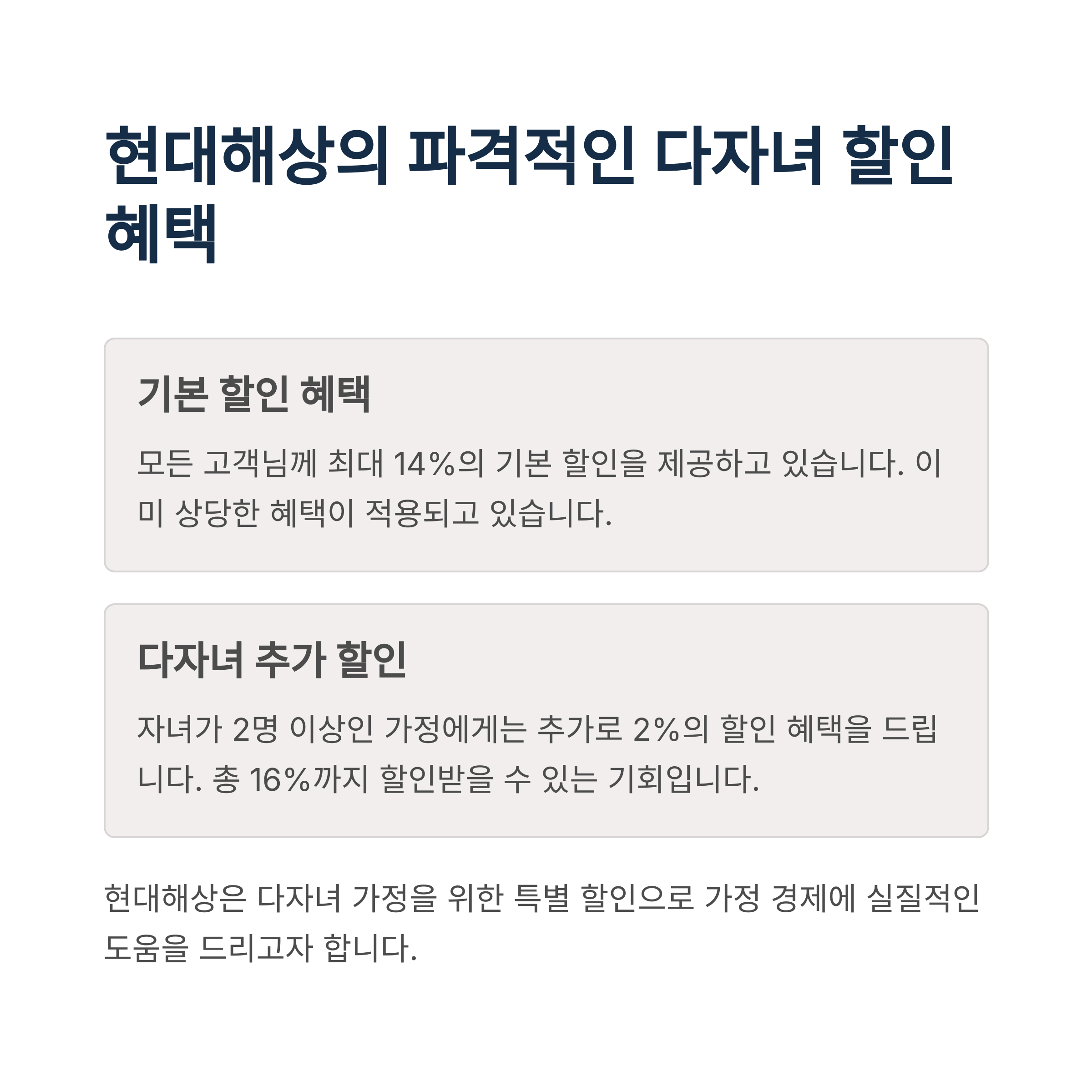 | 현대해상 | 최대 10% | 만 20세 미만 3자녀 이상 | 일부 특약 중복 할인 가능 |