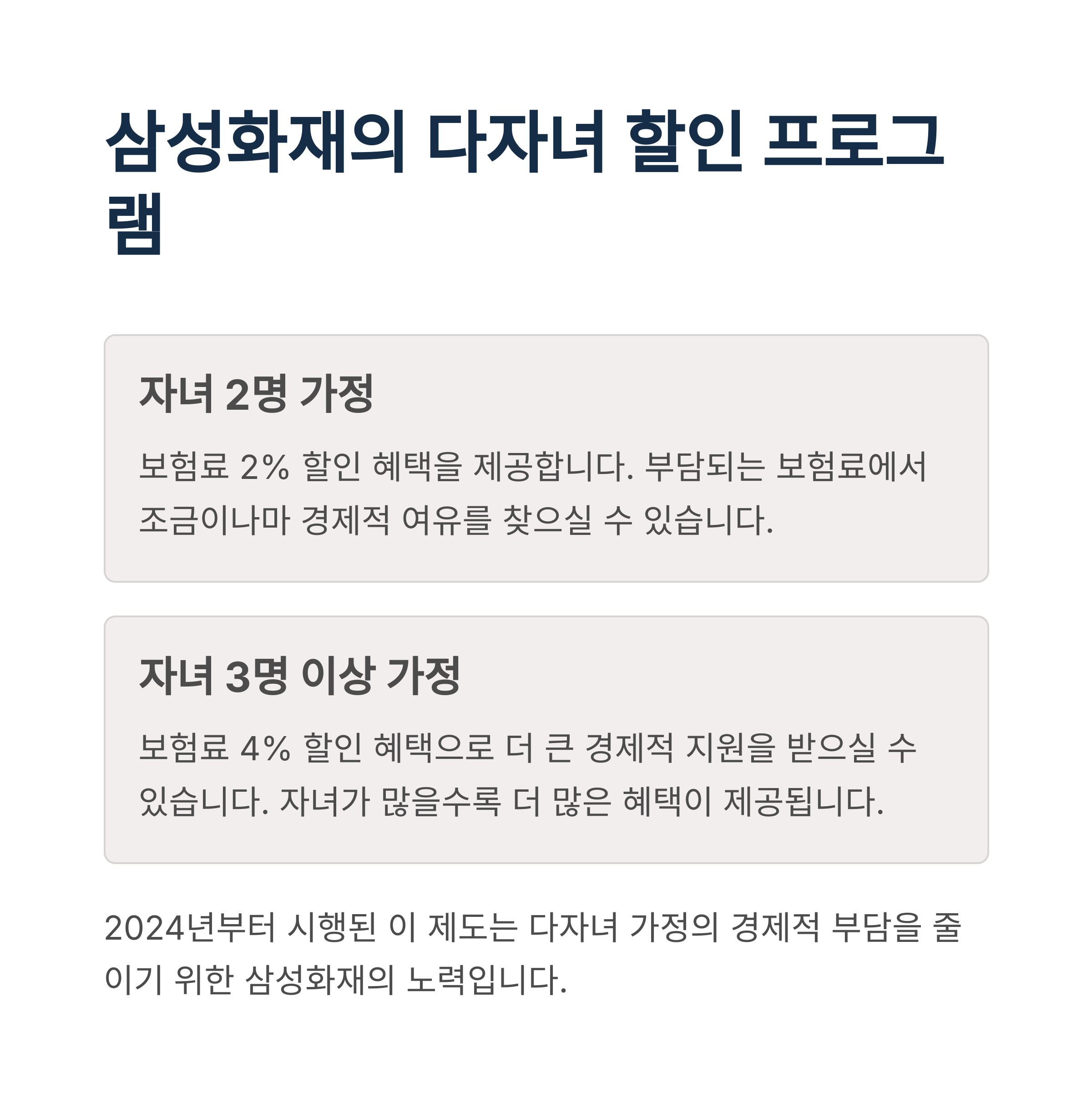 | 삼성화재 | 7~10% | 만 25세 미만 3자녀 이상 | 온라인 신청 가능 |