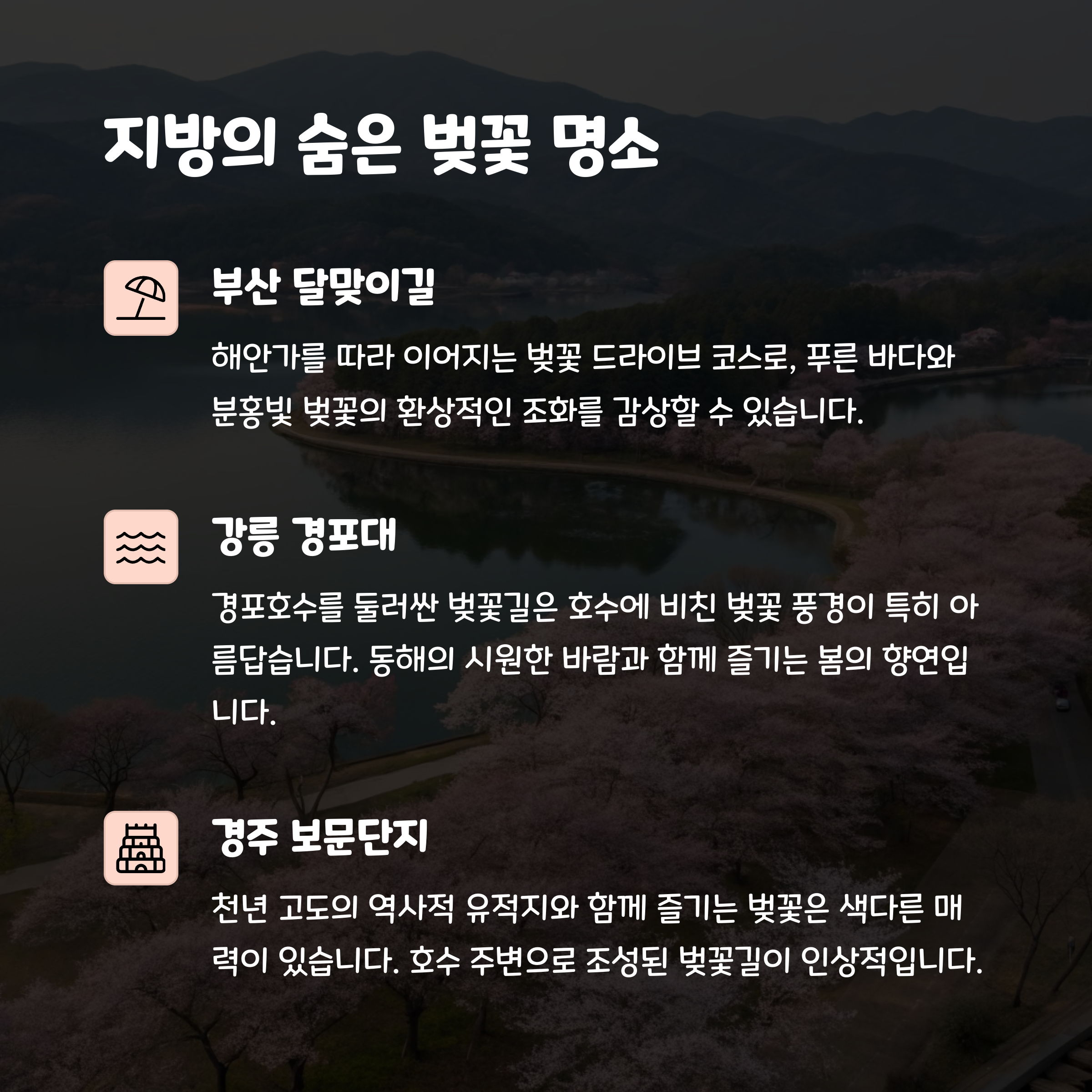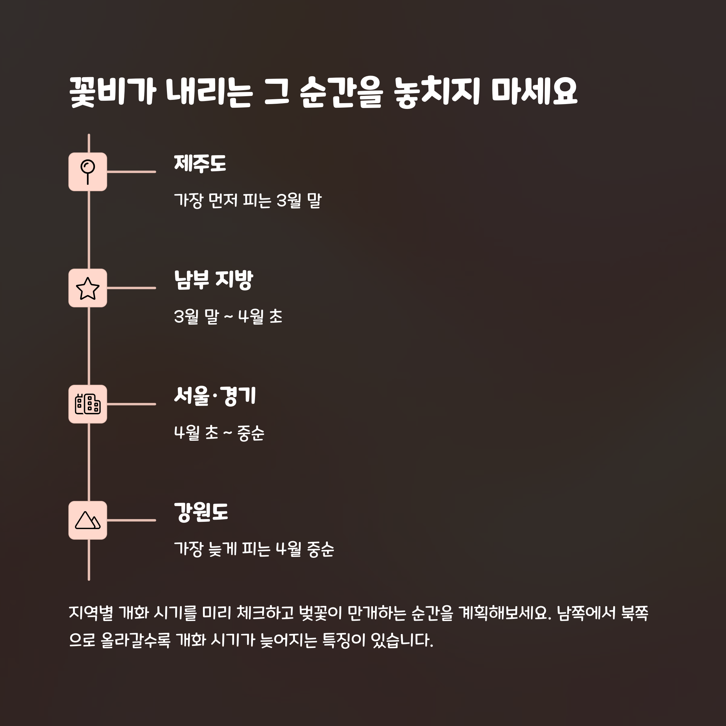 | 벚꽃 개화 시기 | 3월 말 제주에서 시작, 4월 중순 강원까지 순차 개화 |