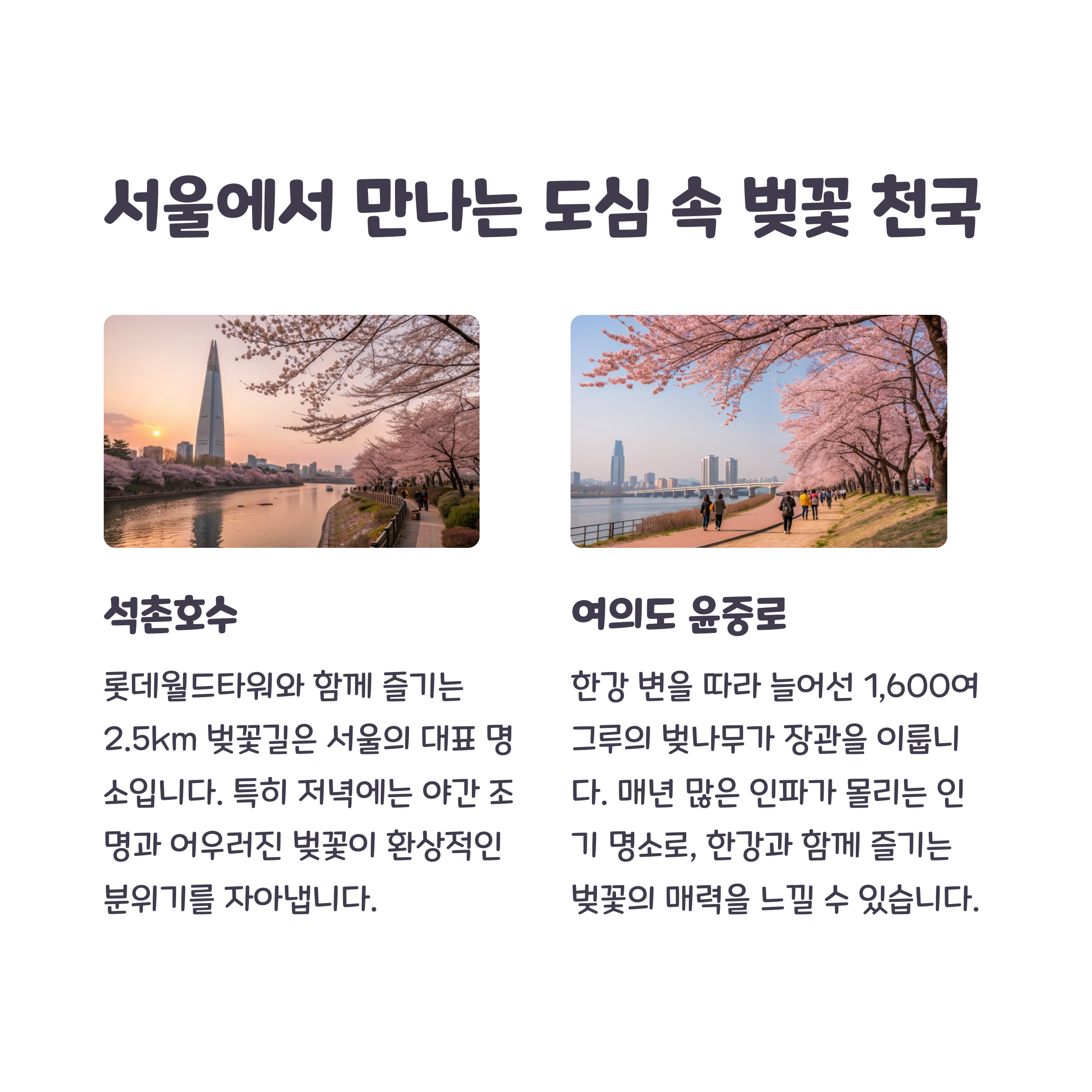 | 3월 말 제주에서 시작, 4월 중순 강원도 도달 | 석촌호수, 윤중로, 진해, 경포대, 전농로 등 | 진해 군항제, 석촌호수 벚꽃축제, 지역별 문화행사 |