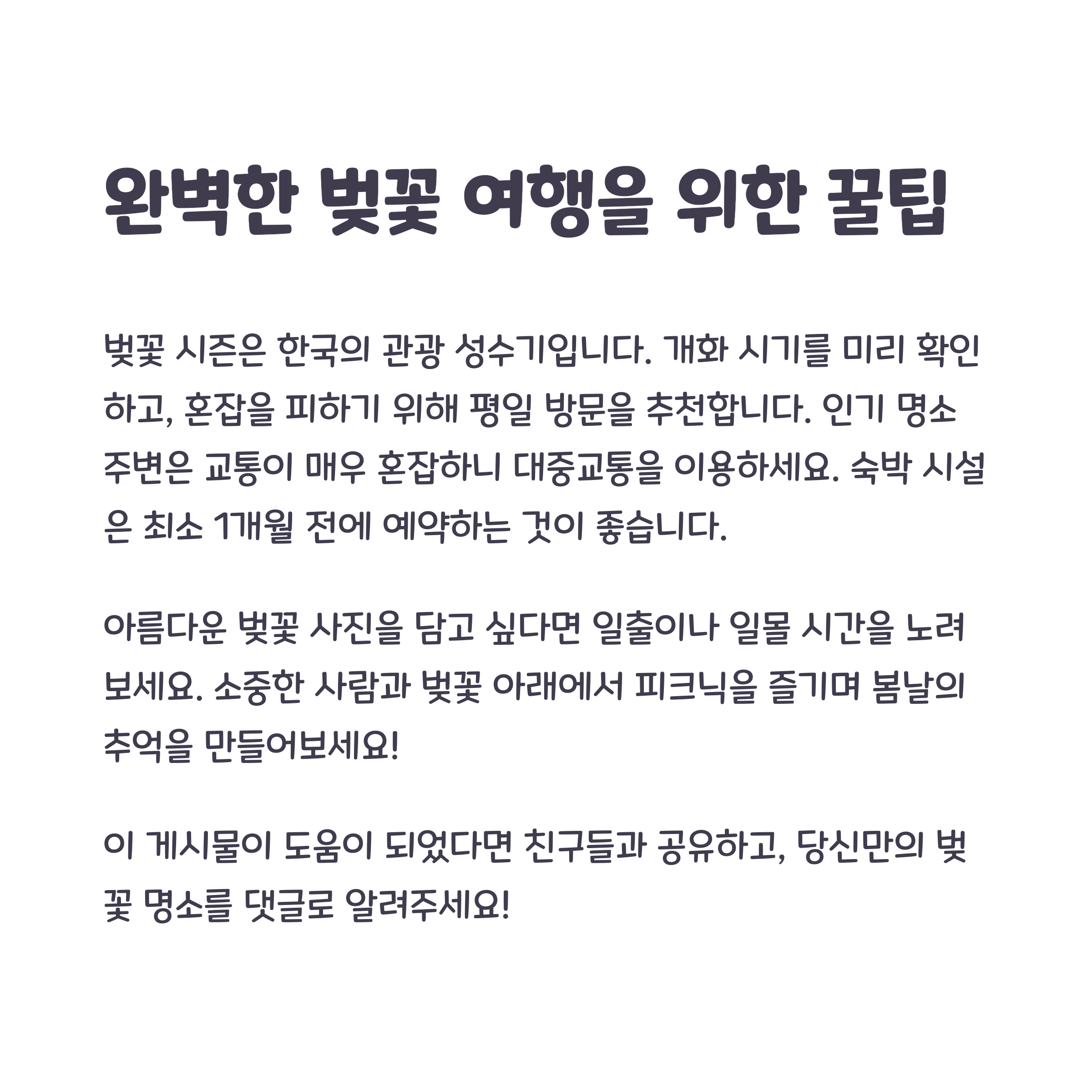 여러분은 4월에 어디로 벚꽃 구경을 가실 예정인가요? 혹은 이미 다녀오신 최고의 벚꽃 명소가 있다면 댓글로 알려주세요! 봄의 설렘을 함께 나눠요.