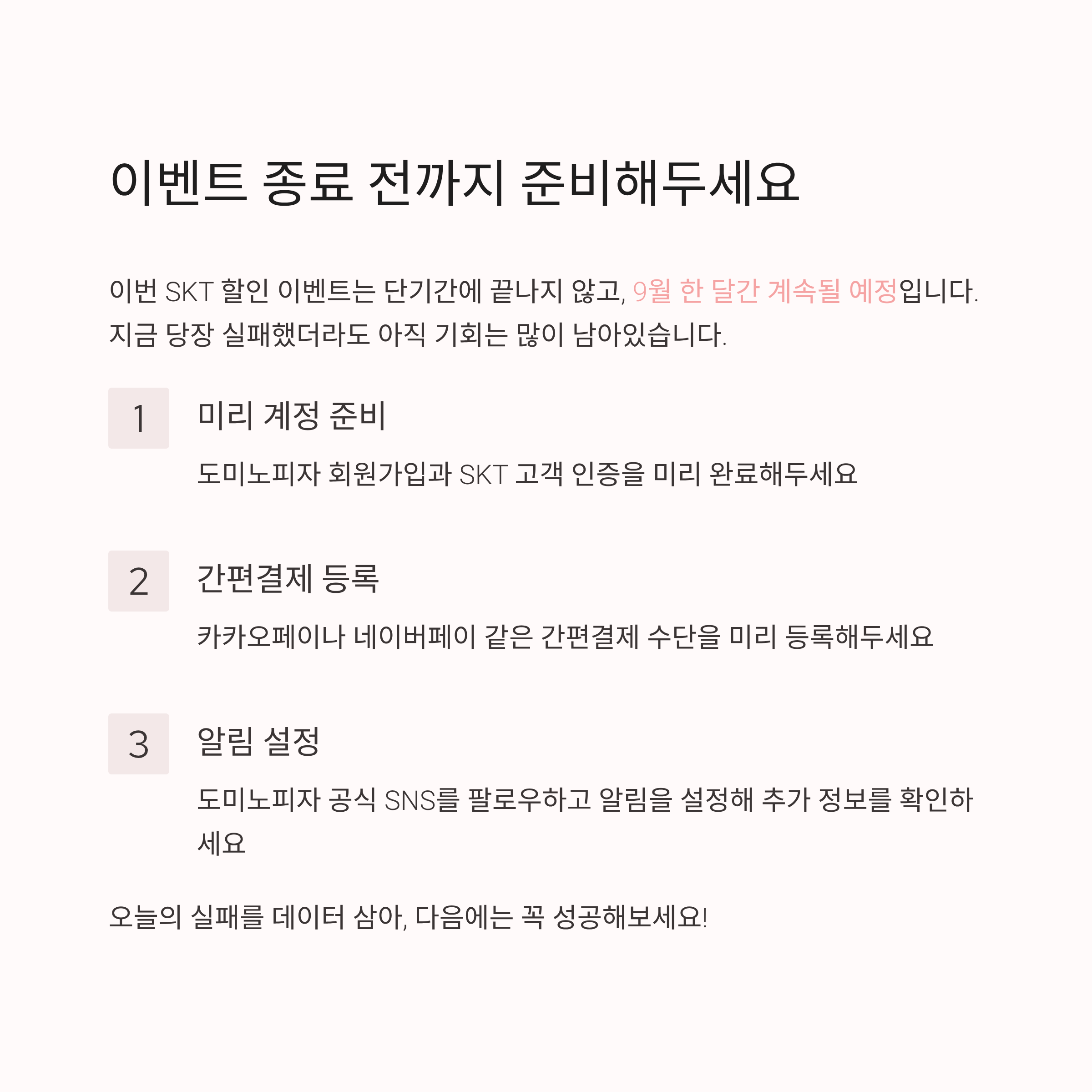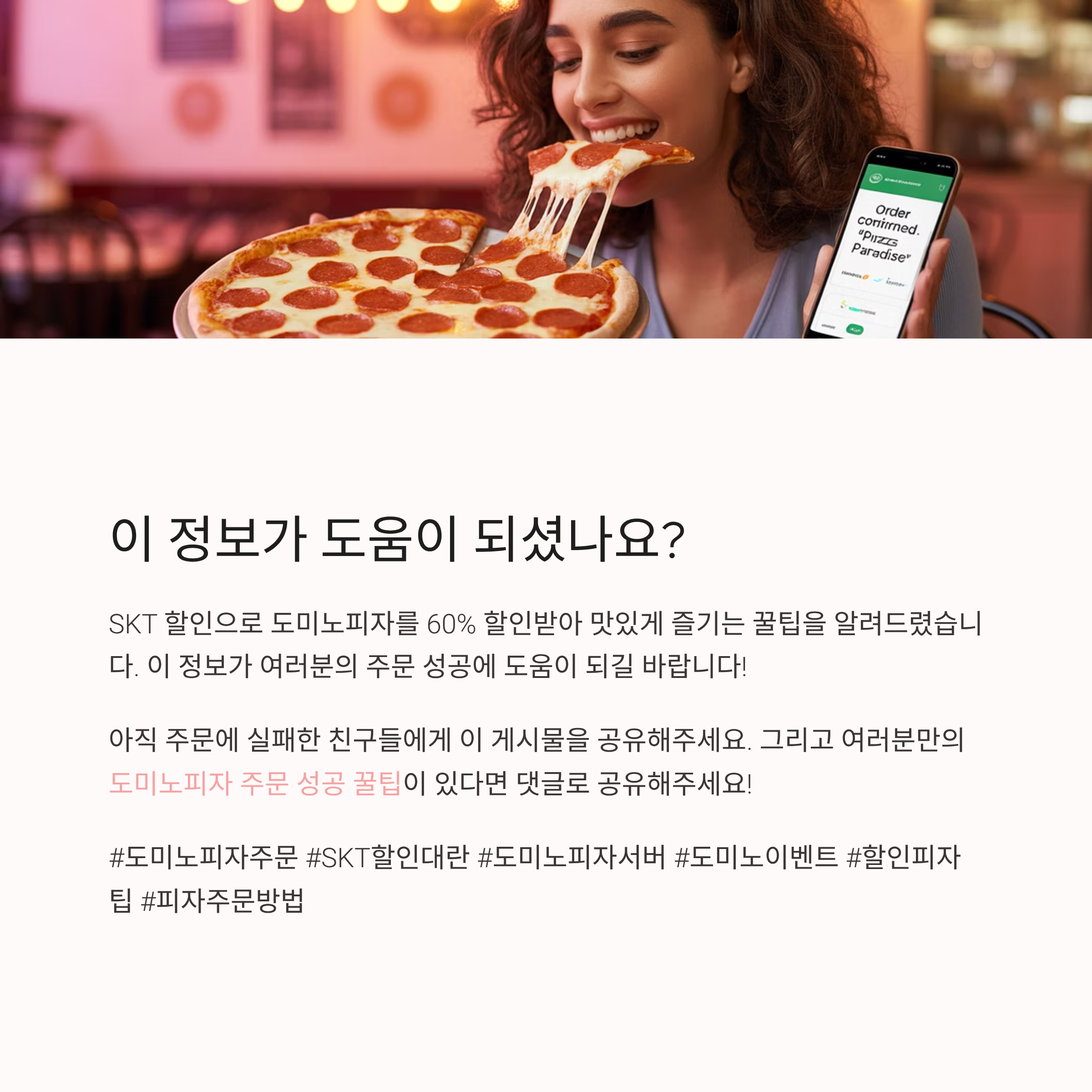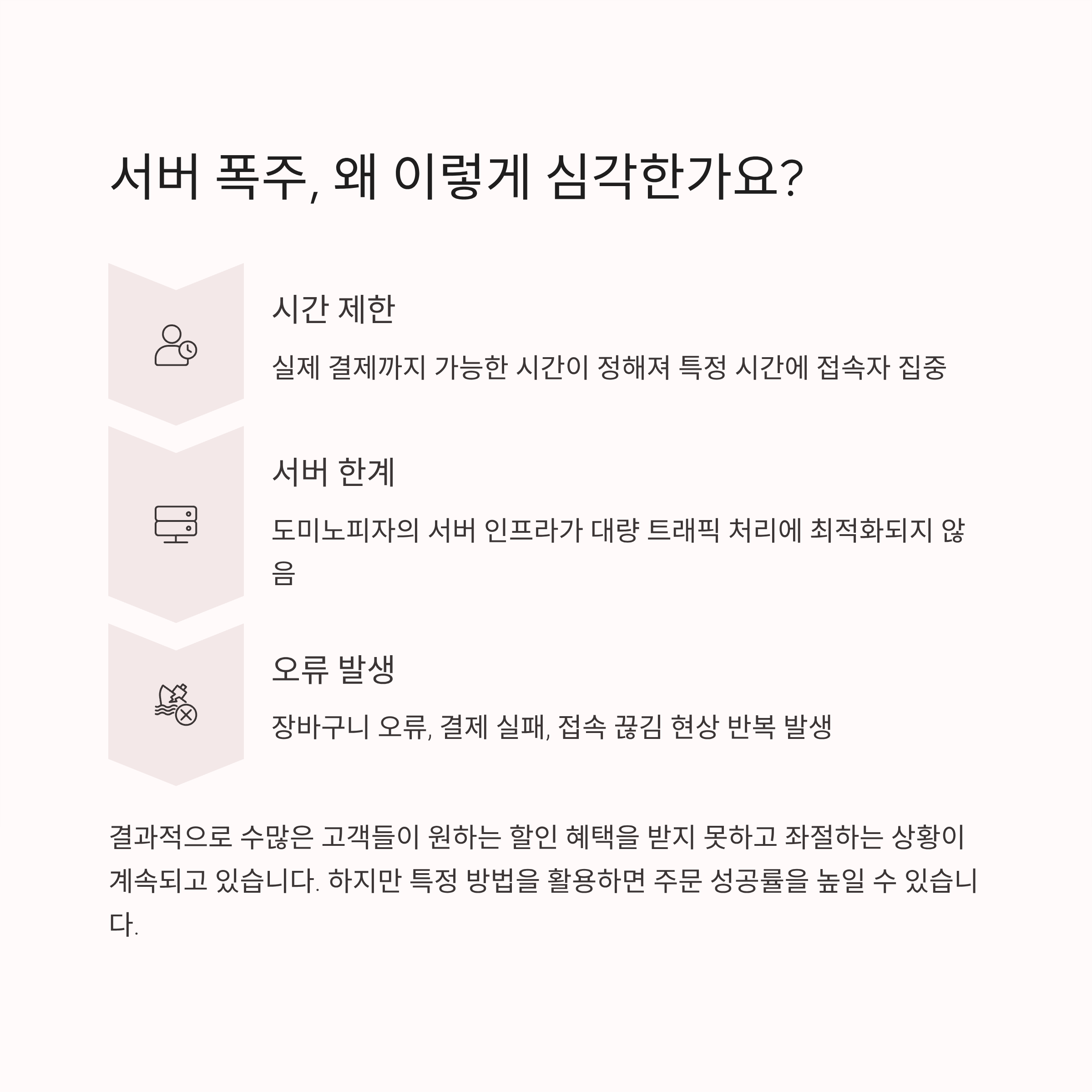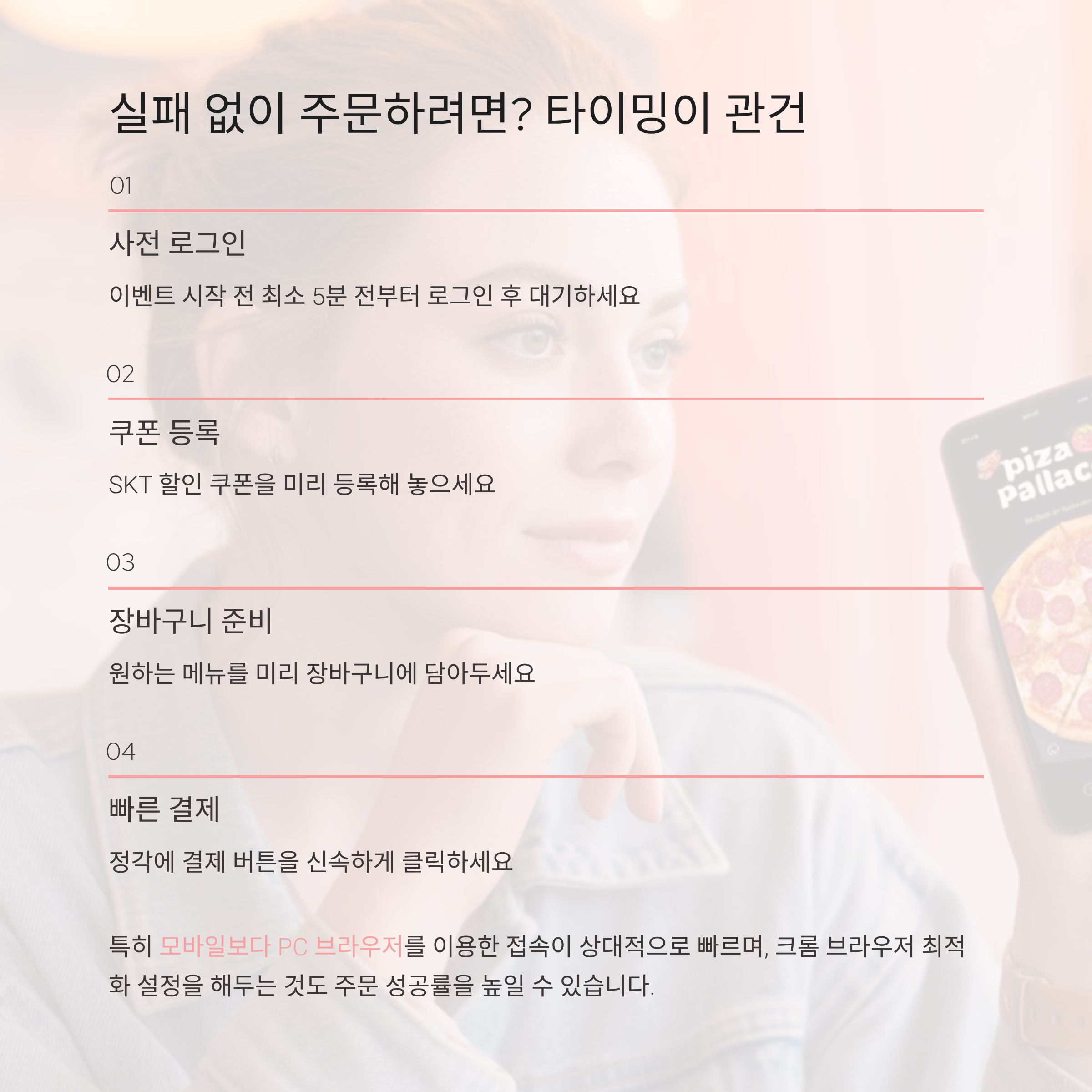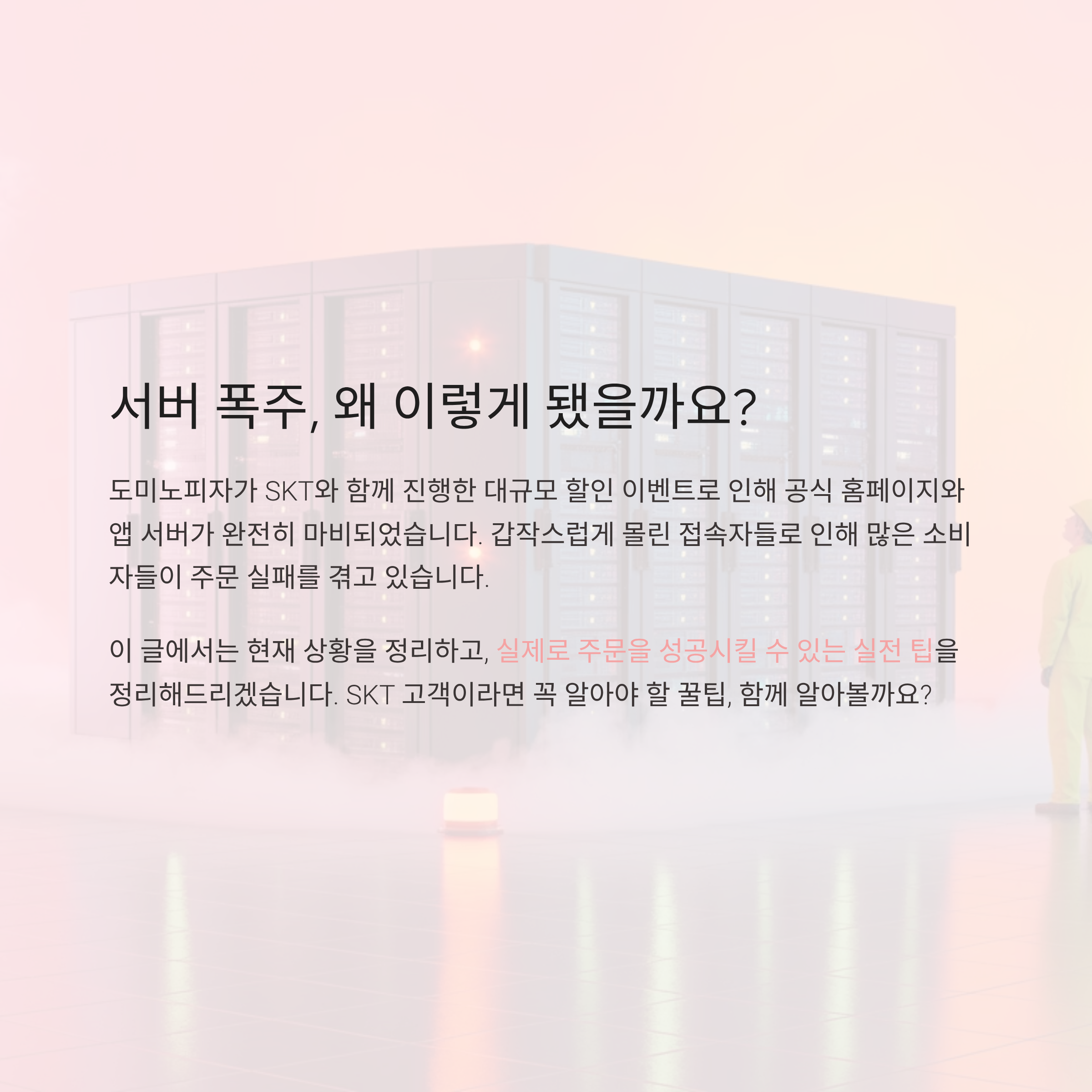도미노피자가 SKT와 함께 진행한 대규모 할인 이벤트로 인해 공식 홈페이지와 앱 서버가 폭주하고 있습니다. 갑작스럽게 몰린 접속자들로 인해 많은 소비자들이 주문 실패를 겪고 있는데요. 이 글에서는 현재 상황을 정리하고, 실제로 주문을 성공시킬 수 있는 실전 팁을 정리해드리겠습니다. SKT 고객이라면 꼭 알아야 할 꿀팁, 지금부터 확인해보세요!