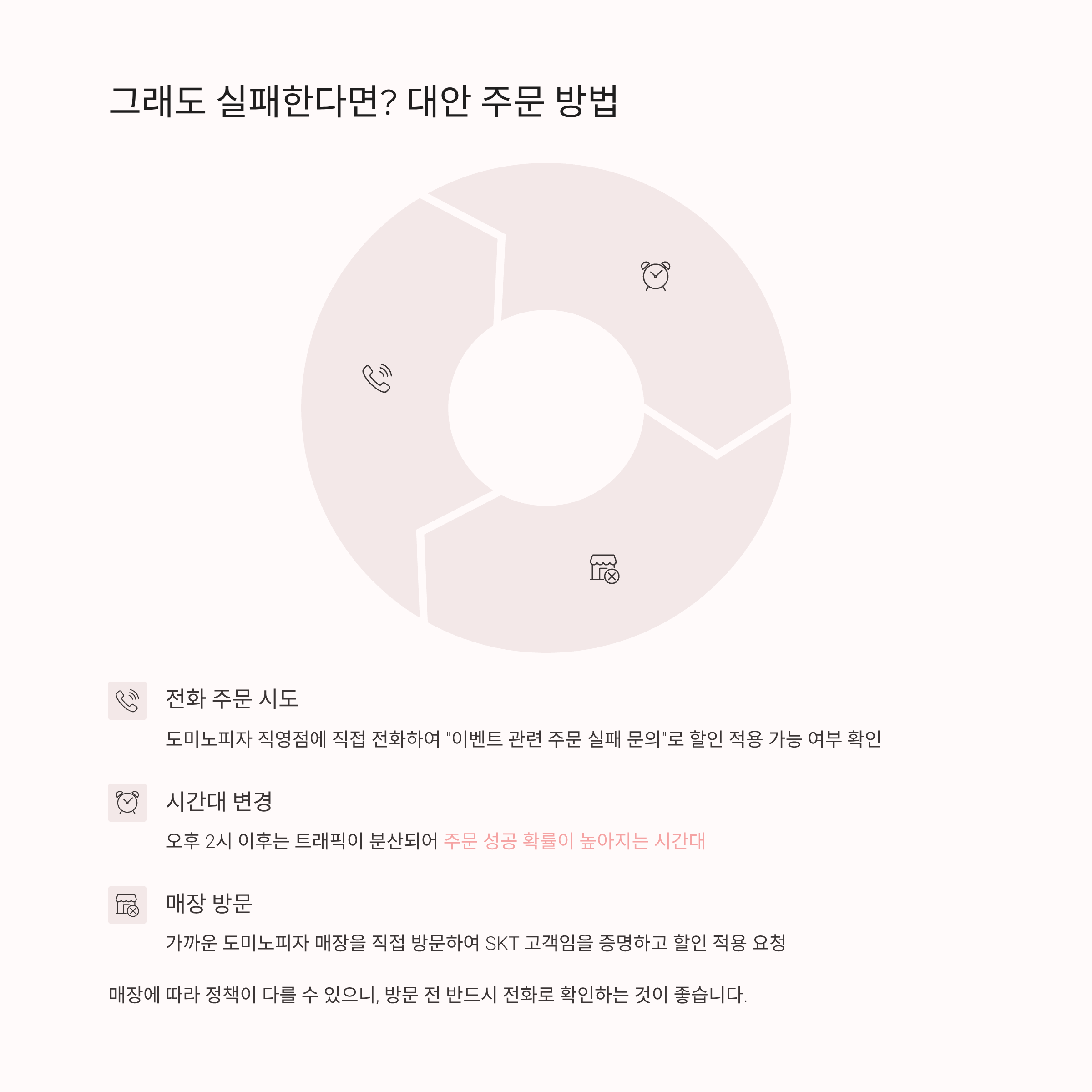 특정 요일 또는 시간대에 한해 SKT 고객이 도미노피자 앱 또는 웹사이트에서 주문 시