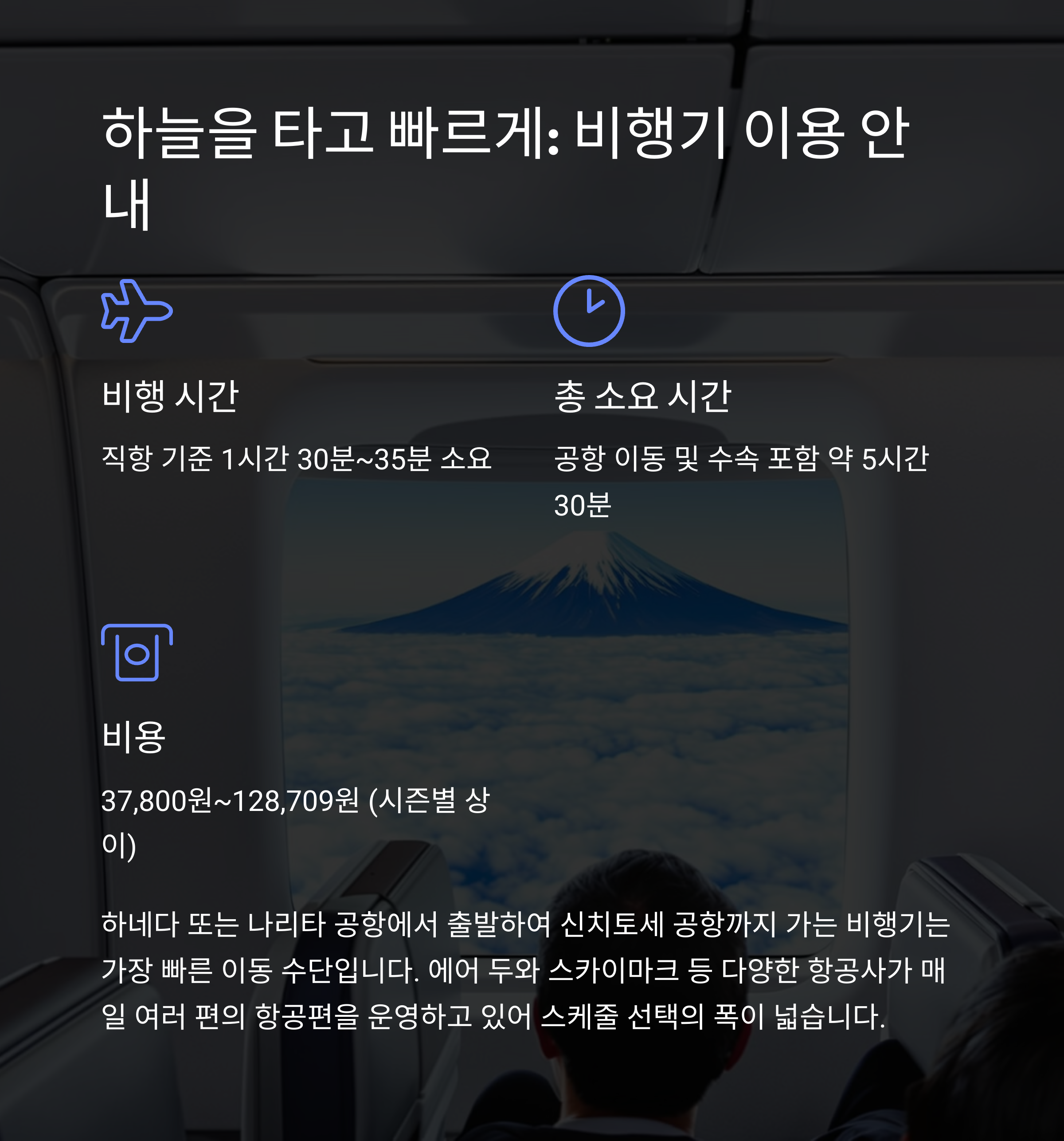 시간을 절약하려면 비행기, 비용과 경험을 중시한다면 신칸센이 적합합니다.