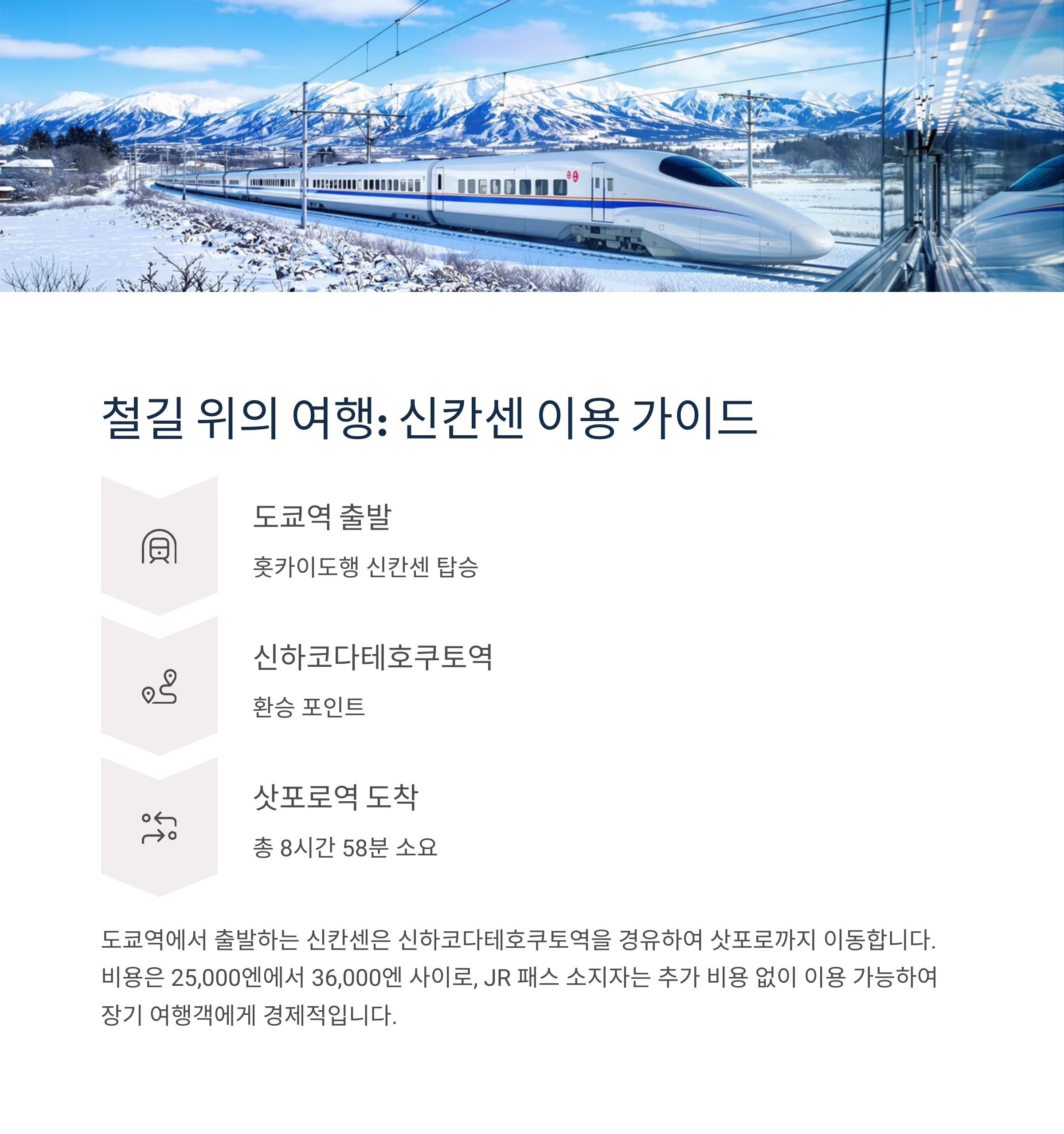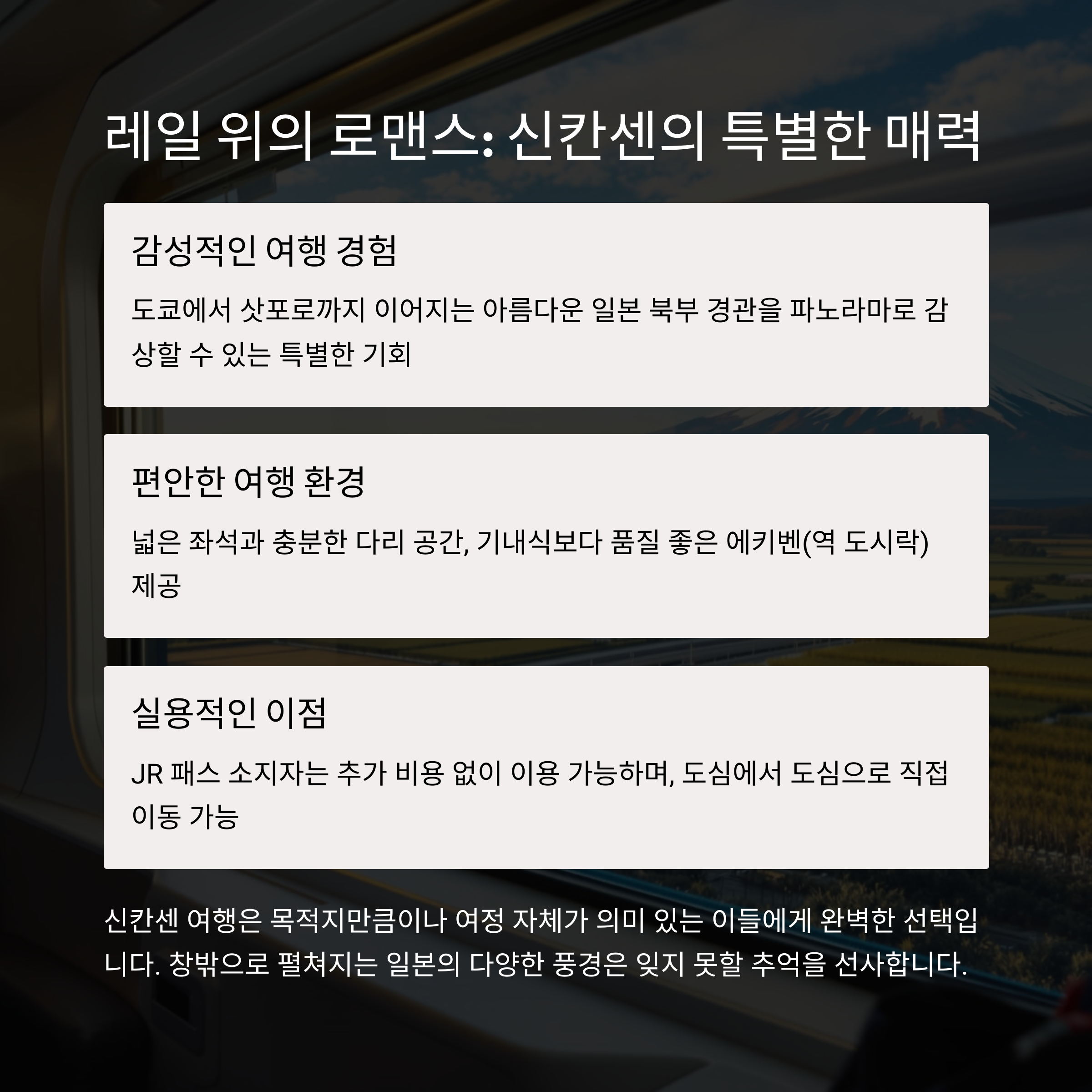 겨울철의 삿포로 여행에서는 신칸센을 유리하게 선택할 수 있습니다. 폭설로 공항 이동이 불편할 수 있는 환경에서 철도는 안정적입니다.