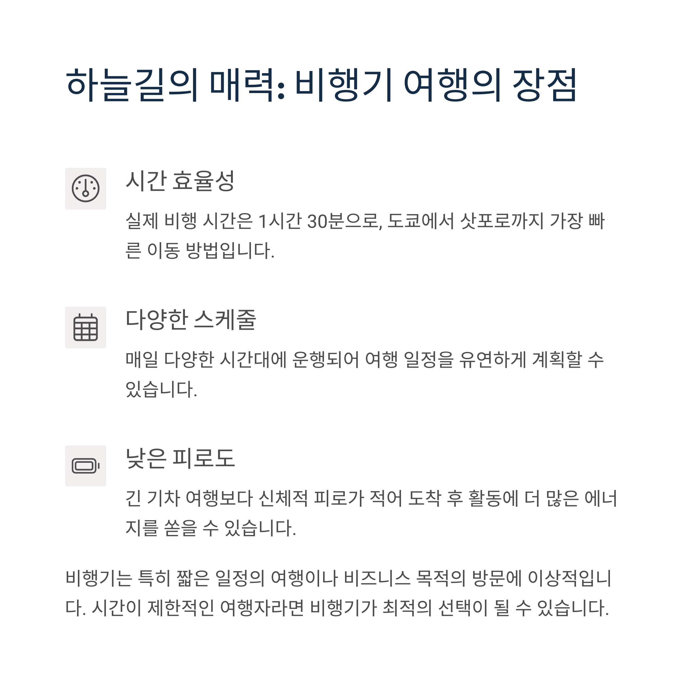 장거리 여행에서 중요하게 느껴지는 편안함이 신칸센의 주된 장점으로 작용하며 특히 고령자나 어린 자녀 동반 여행자에게 추천됩니다.