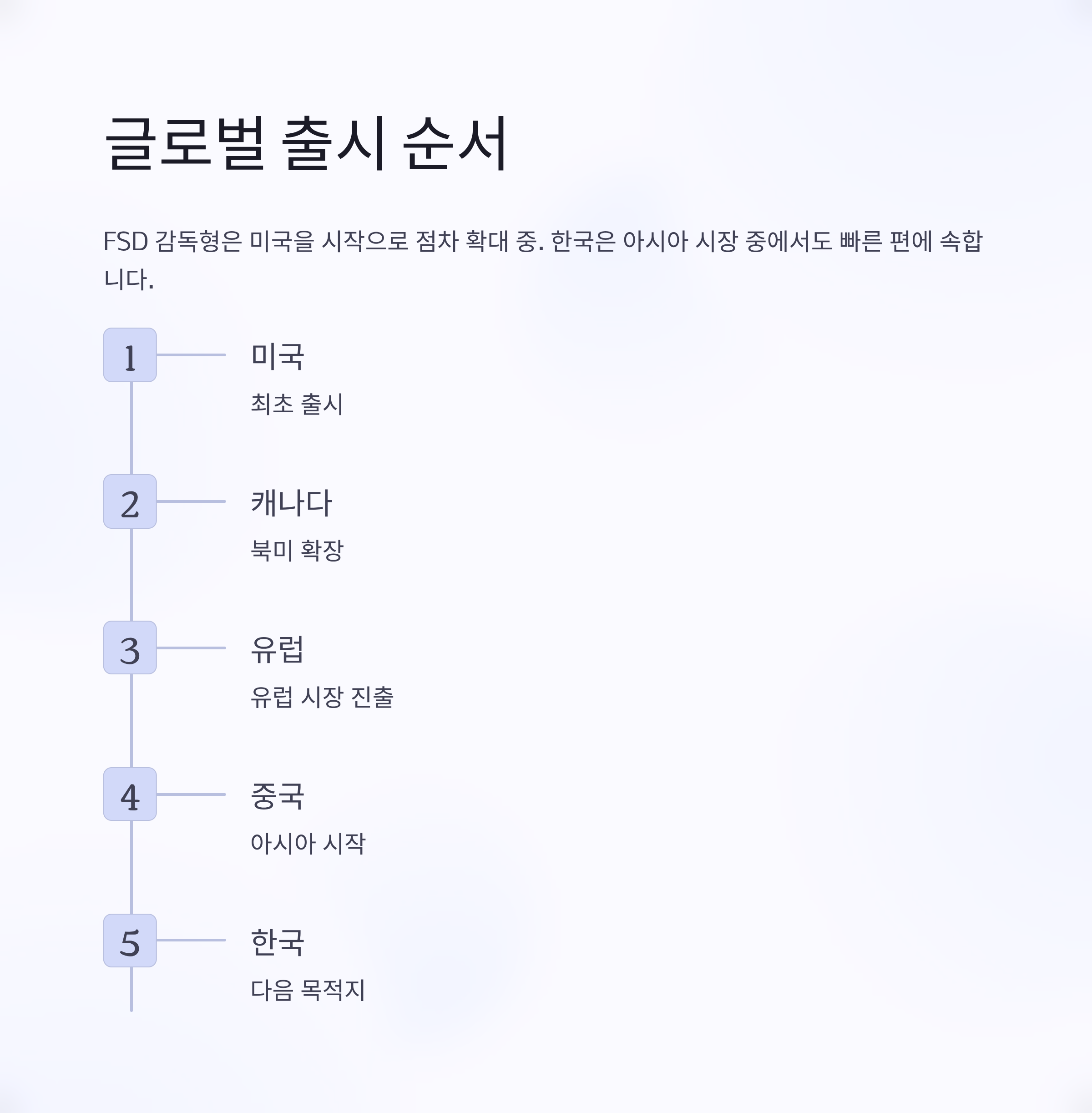 FSD 감독형은 미국을 시작으로 캐나다, 유럽, 중국 순으로 점차 확대되고 있으며, 이번 한국 포함은 아시아 시장 중에서도 빠른 편에 속합니다.
