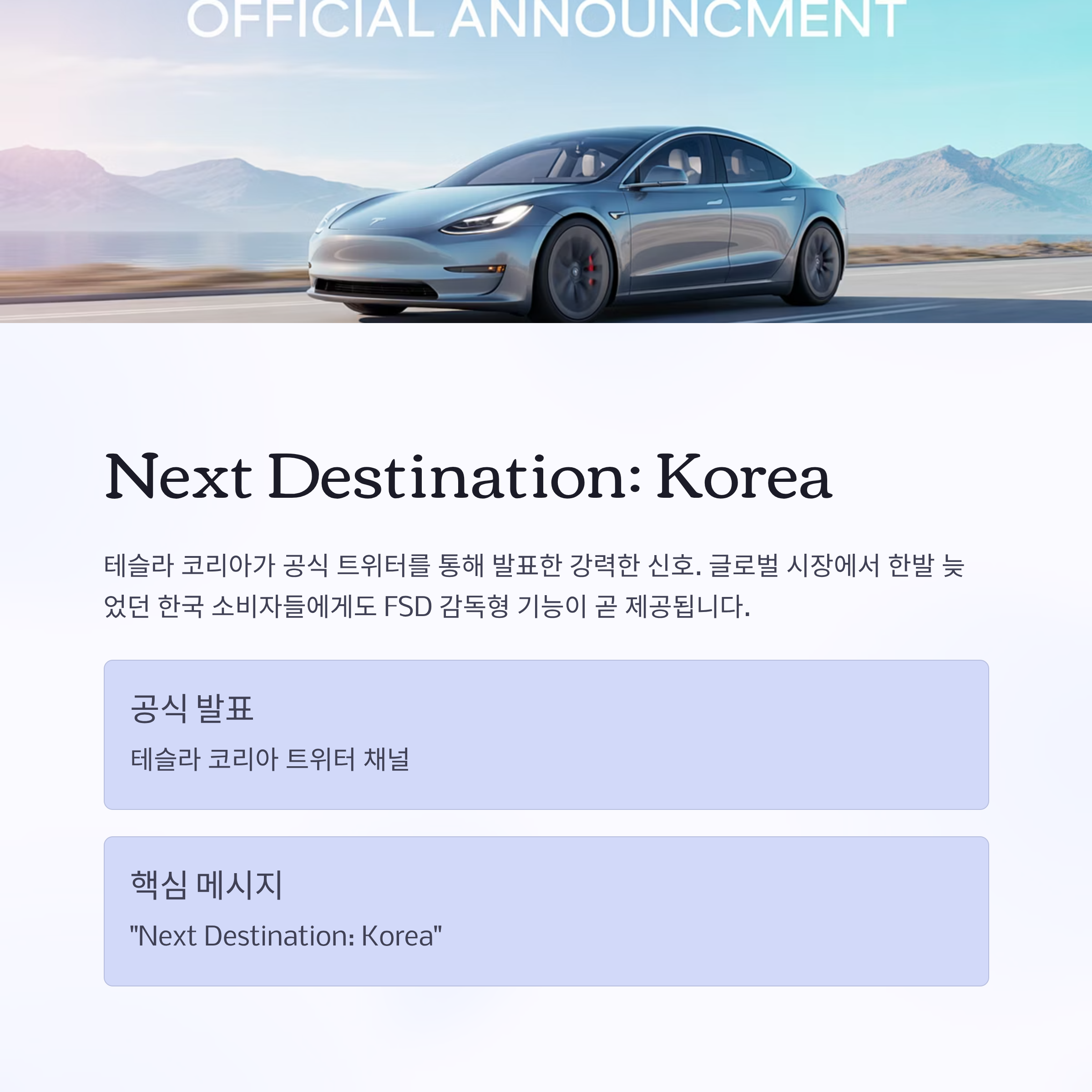 | 발표 채널 | 테슬라 코리아 공식 트위터 |