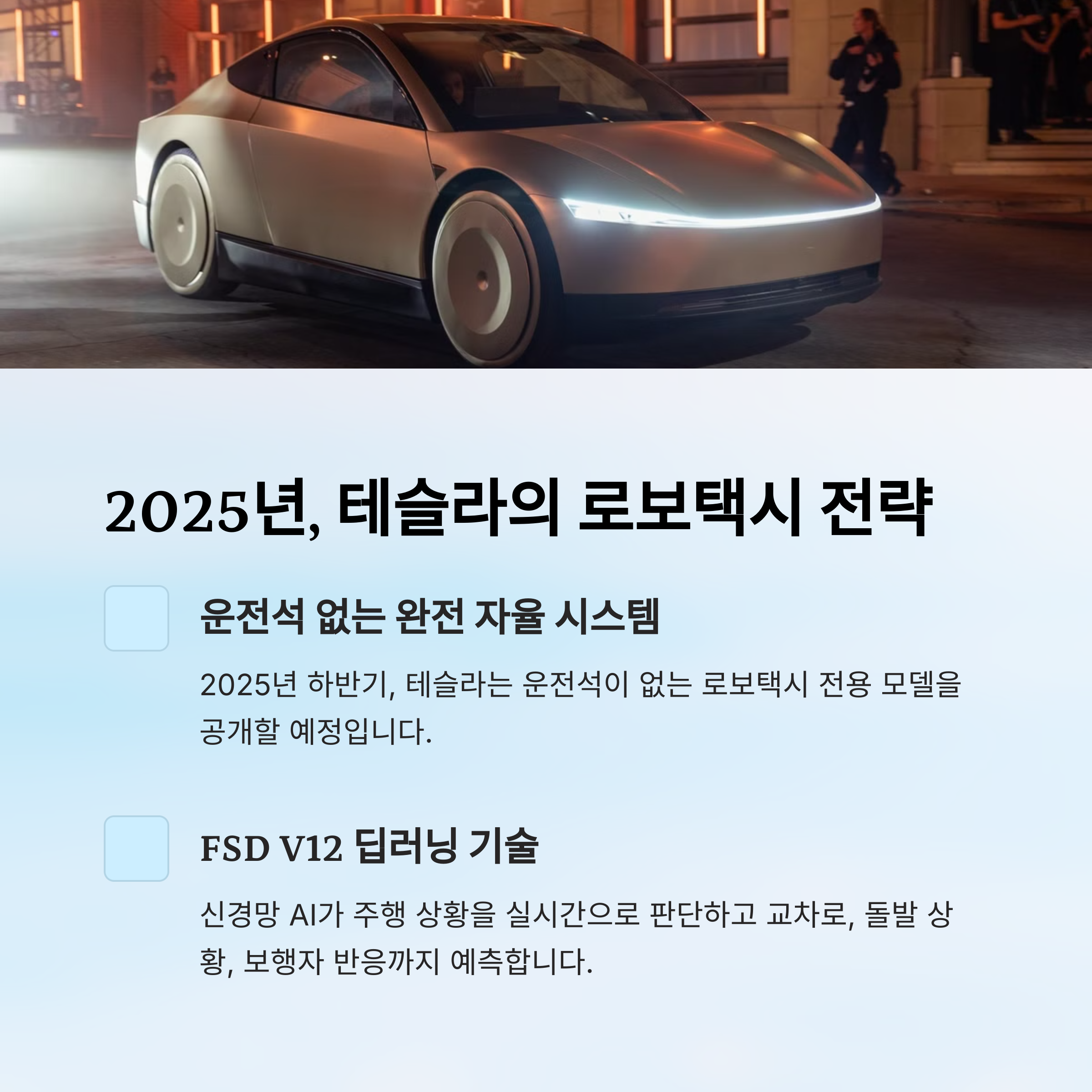 2025년 하반기, 테슬라는 로보택시 전용 모델을 공개할 예정입니다.