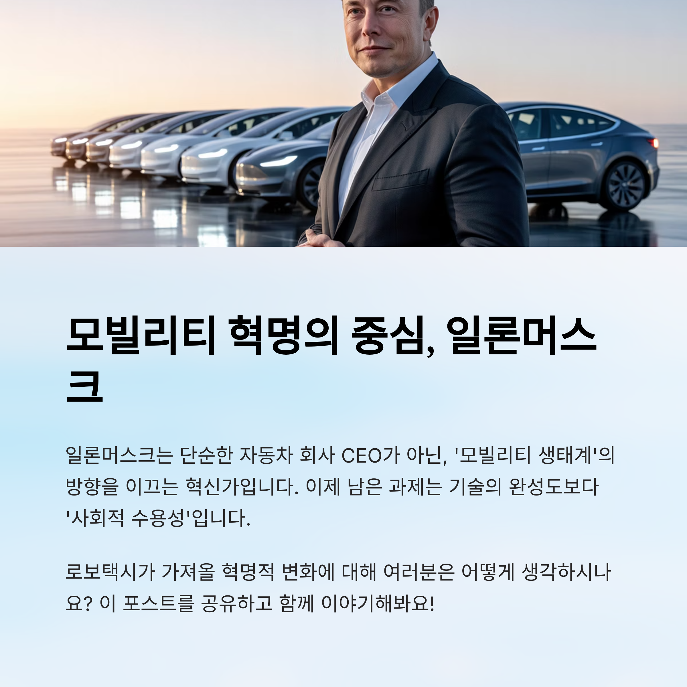 일론머스크는 지금 ‘모빌리티 생태계’의 방향을 이끄는 인물입니다.