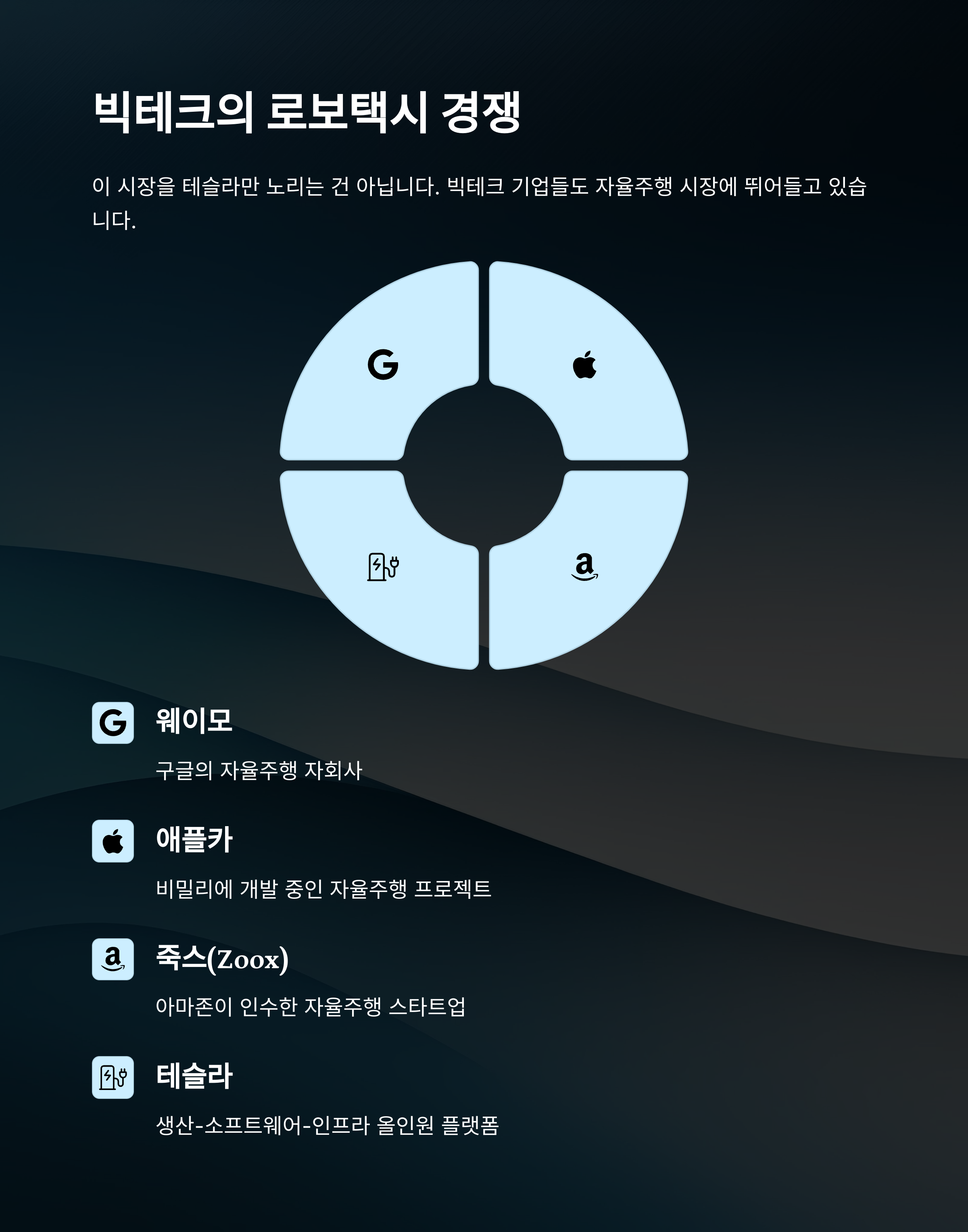 구글 웨이모, 애플카 프로젝트, 아마존의 죽스(Zoox) 등
