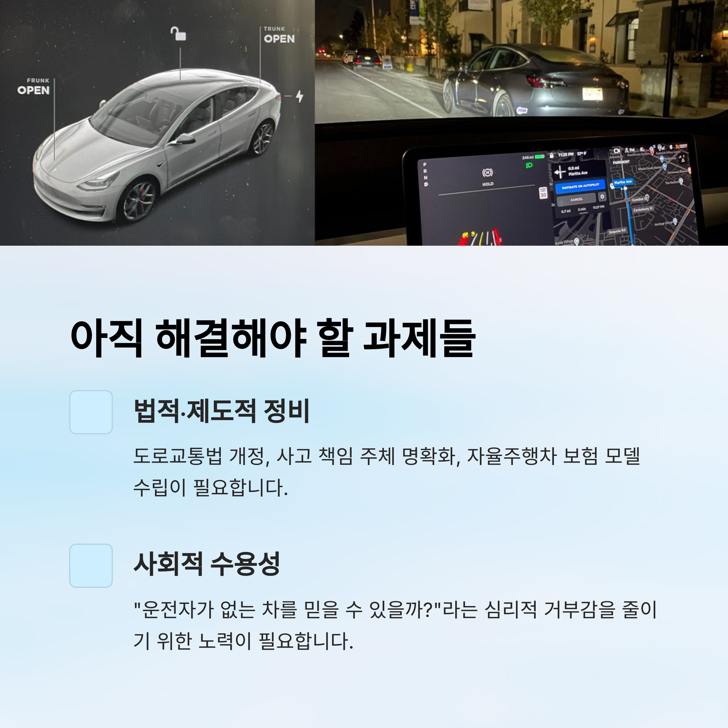 자율주행차 보험 모델 수립 등 제도 정비가 필요한 상황입니다.